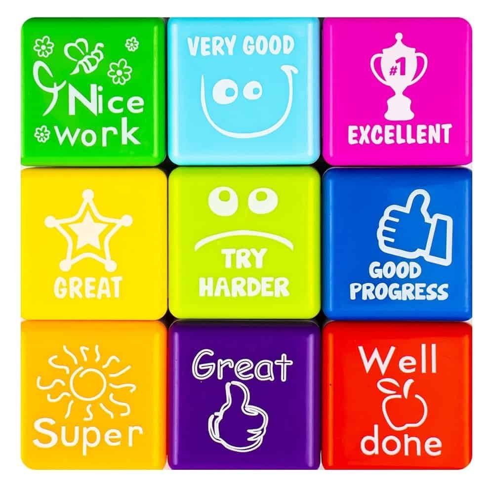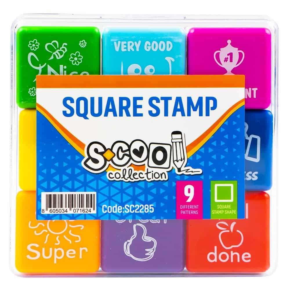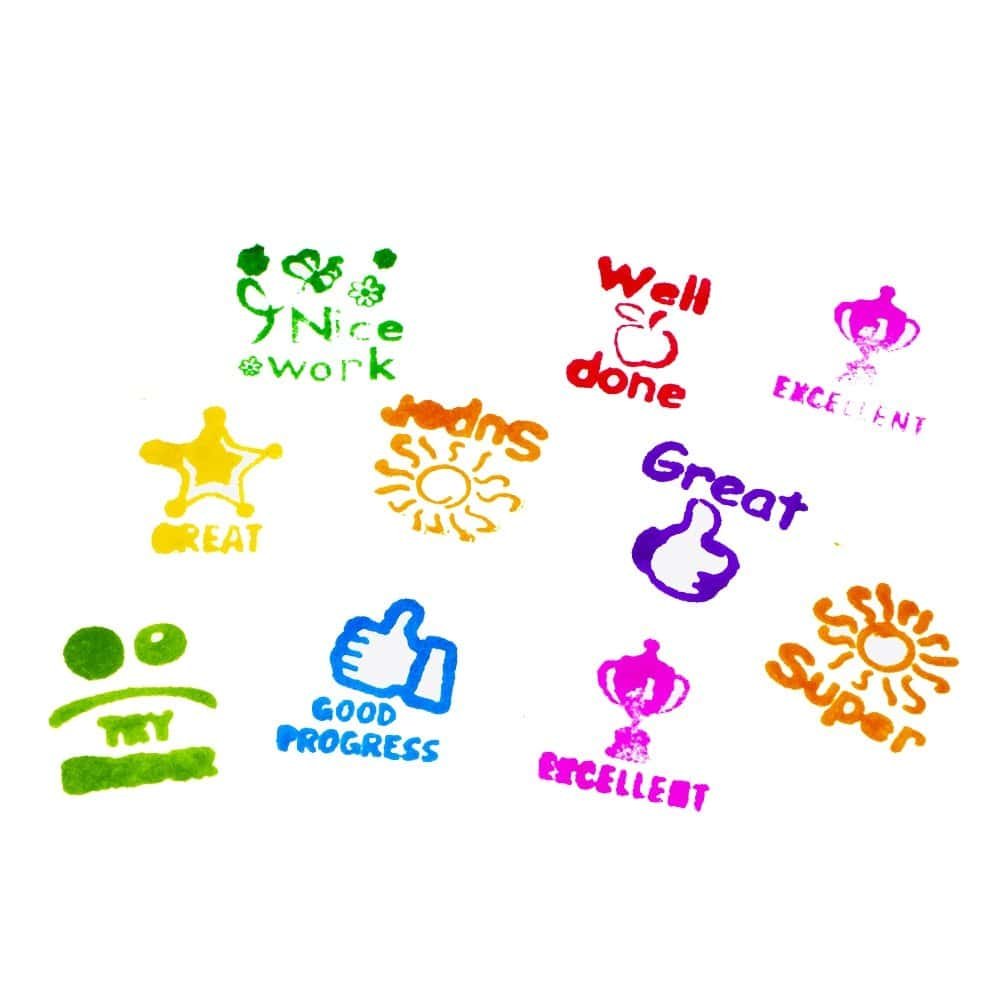 - Setul contine 9 stampile patrate in 9 culori cu mesaje diferite: rosu - bine facut, portocaliu - super, mov - grozav, verde - lucru frumos, albastru - foarte bun, albastru inchis - evolutie buna, roz - excelent, galben - grozav, verde deschis - incearca mai tare.