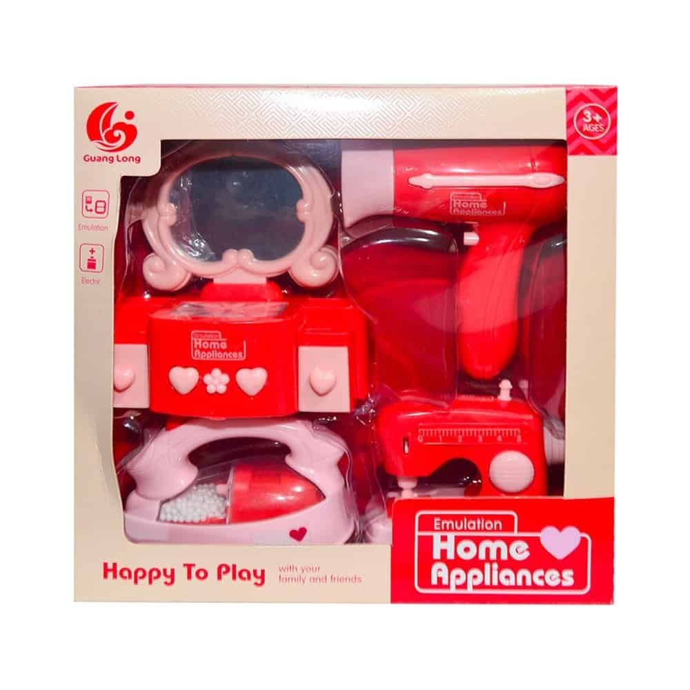 Set 4 jucarii (electrocasnice)- uscator de par, masina de cusut, fier de calcat, masa pentru machiaj papusi