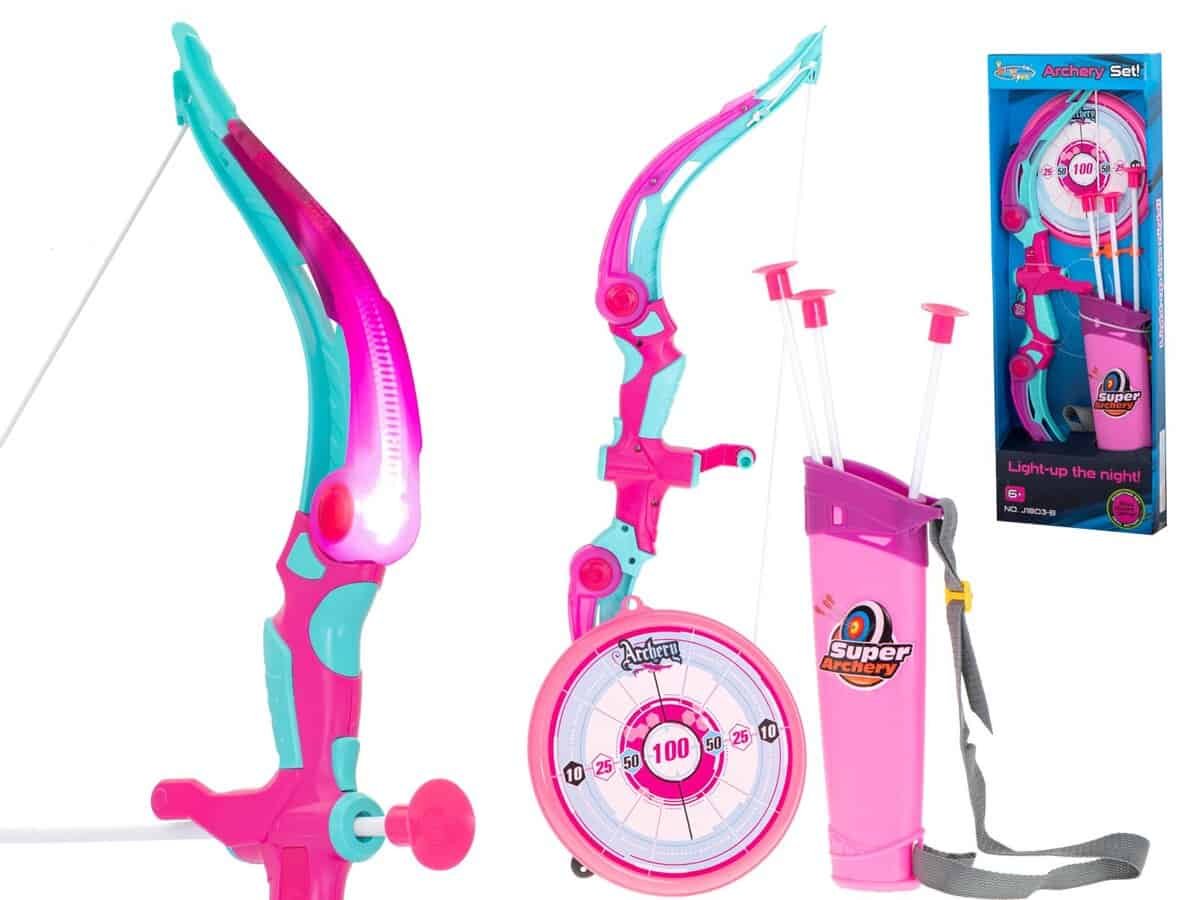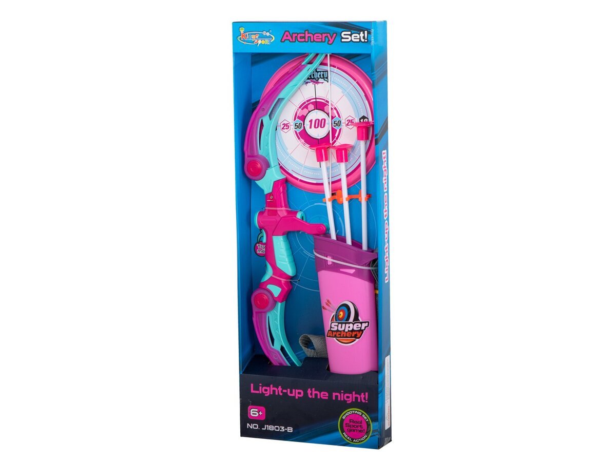 Set de tragere - arc cu săgeți și țintă. Ideal pentru micii războinici și pentru fanii indieni. Include: scut, arc, tolba cu săgeți, 3 săgeți cu ventuze. Culoare: roz. Sursa de alimentare: 3x AG13 (inclus). Diametrul țintă: 20cm. Lungimea arcului: 53cm.