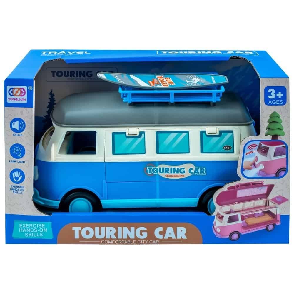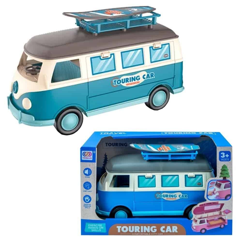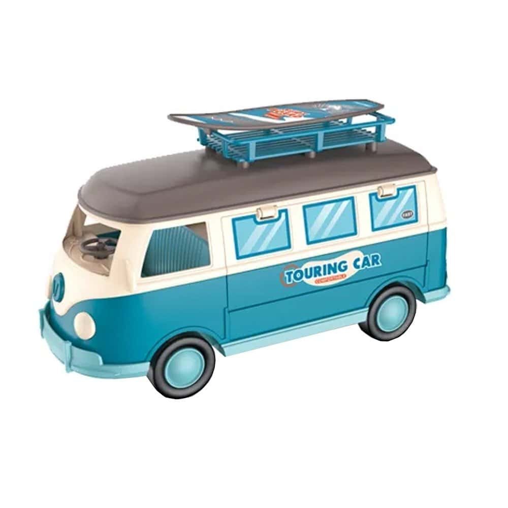 - Design-ul masinii ii va incanta cu adevarat pe copii, deoarece plafonul se ridica, usa din spate si una din partile laterale se deschid, permitand accesul facil in interior pentru ca podeaua si plafonul sa poata fi decorate cu usurinta. Microbuzul rulota are volan ce se roteste si, de asemenea, portbagaj pentru plafon si placa de surf detasabile ceea ce va varia scenariile de joc. In partea din spate a vehicului este un inel pentru atasare. Dar nu numai atat, vehiculul echipat cu baterii are faruri care se aprind intermitent si sunet de pornire, claxon si sunete de deplasare, functii declansate printr-o simpla apasare a butonului frontal.