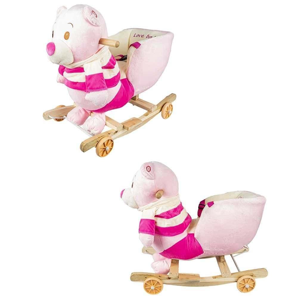 Balansoar pentru bebelusi, Ursulet, lemn + plus, cu rotile, roz, 55 cm