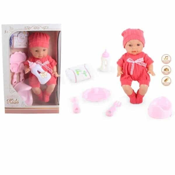 Papusa cu accesorii completeaza peisajul jocului de copil.