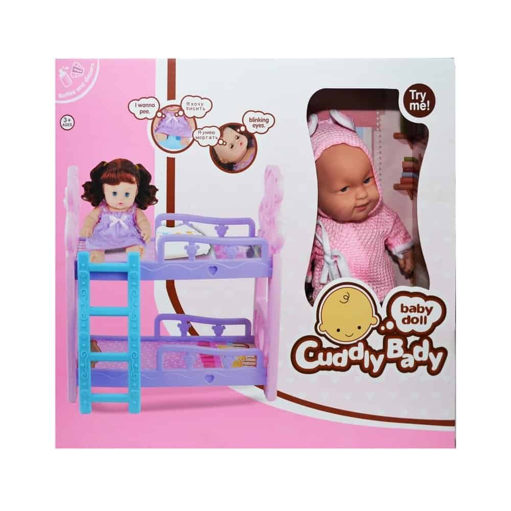 Setul contine: bebelusul muzical, patut, sticluta, olita si scutec.