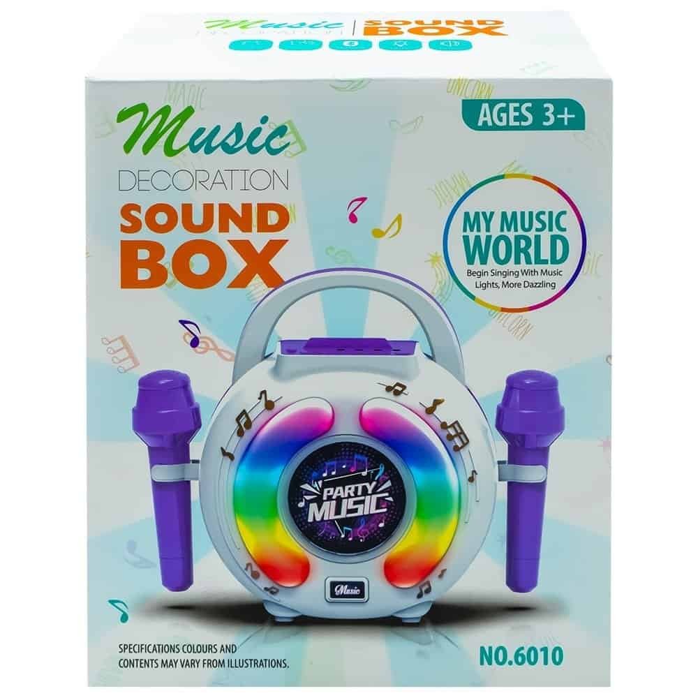 - Boxa are diverse functii activate prin apasarea scurta a butoanelor: 10 melodii, aplauze, inregistrare, schimbare voce, 5 moduri de iluminare, reglare volum pe patru treapte. Primele patru butoane au functie dubla, iar prin apasarea lunga a acestora comutati manual modul de redare bluetooth/normal, cantecul precedent, redare/pauza, urmatorul cantec. Aparatul este echipat cu patru porturi jack: unul pentru casti, doua pentru cele doua microfoane incluse si unul pentru MP3 player. Jucaria are functie de salvare energie, astfel, daca nici o operatiune nu este efectuata timp de 5 minute boxa intra in repaus, moment care este semnalizat sonor. Pentru a reporni sistemul apasati din nou comutatorul de alimentare. Cand conexiunea in modul Bluetooth sau MP3 este activata, functia de repaus este anulata. Boxa este realizata din plastic de calitate, alb si mov, fiind decorata cu imprimeu cu note muzicale.
