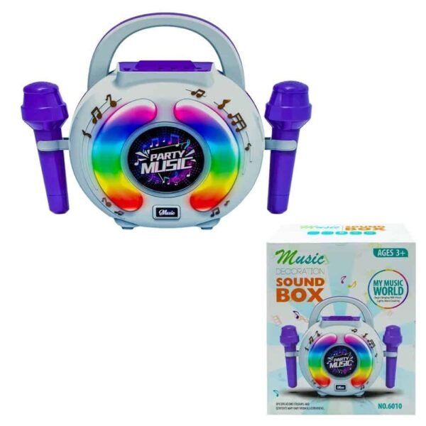 - Boxa functioneaza cu 4 baterii AA 1.5V (nu sunt incluse) si are 10 melodii, sunet de aplauze, functie de inregistrare, schimbare voce, 5 moduri de iluminare, reglare volum conexiunne bluetooth, patru porturi jack (casti, microfoane, MP3 player) si functie de salvare energie.