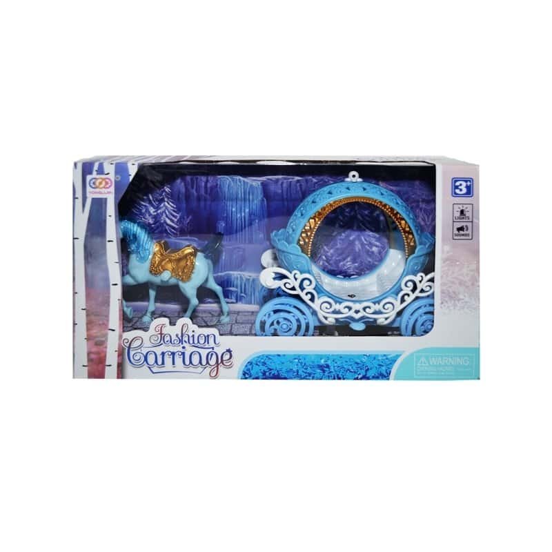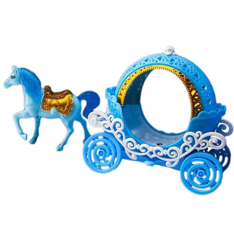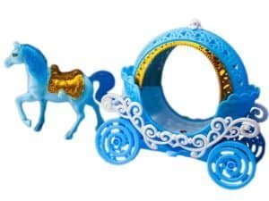 -Calutul are coama colorata alb / albastru, calutul albastru, saua aurie si caleasca albastra cu accente albe