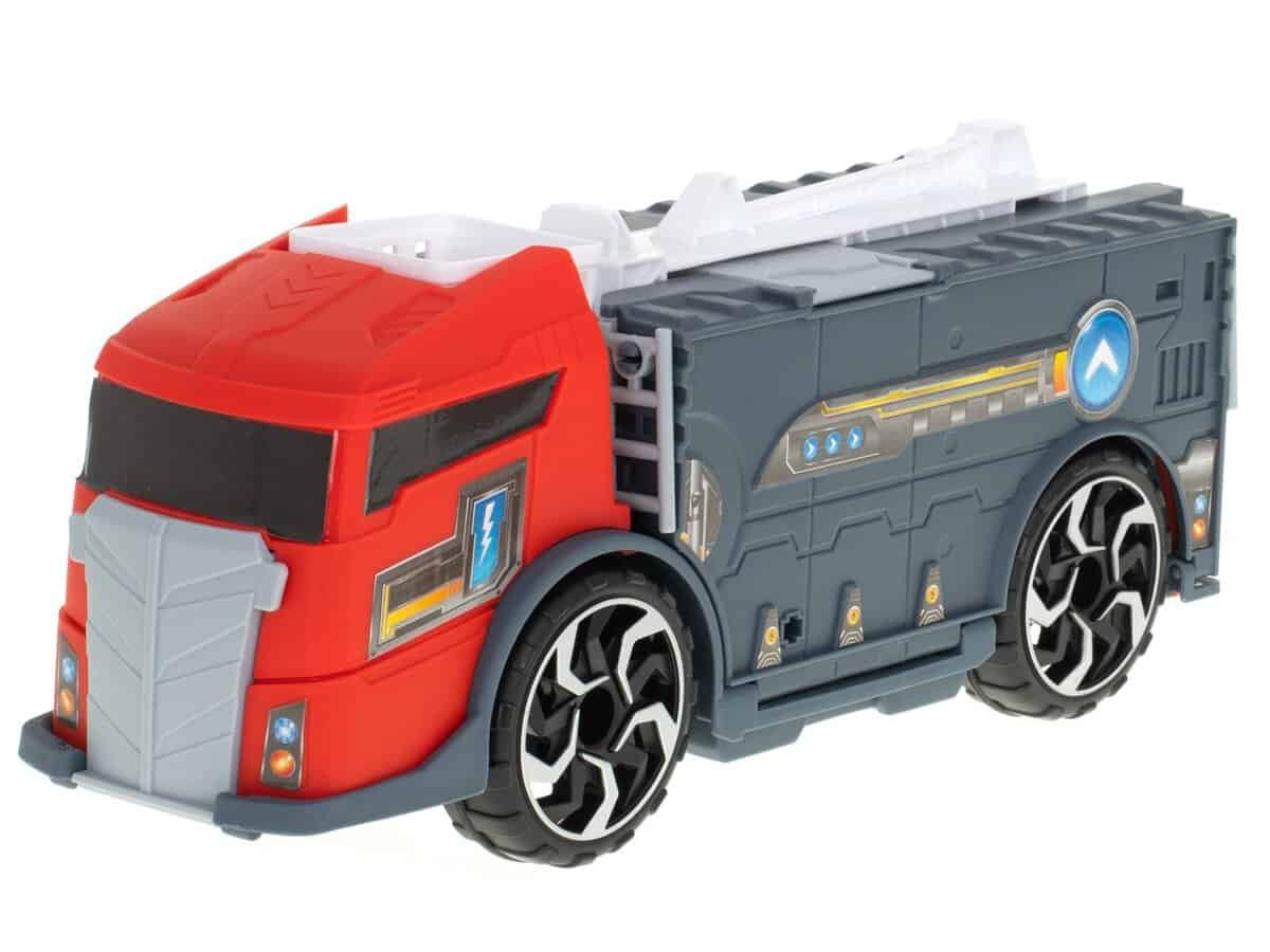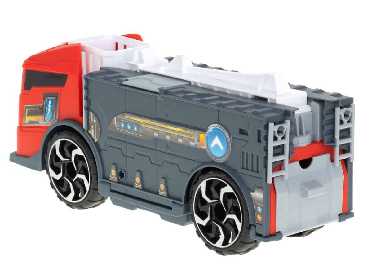 Un mijloc de transport de mari dimensiuni, sub forma unui camion de pompieri, care poate transporta vehiculele atașate pe puntea sa.