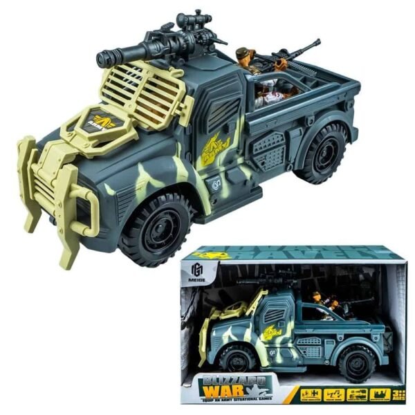 - Vehiculul imita ca design o camioneta blindata, fiind echipat cu figurina soldat detasabila, arma pe plafonul cabinei si mitraliera pe platforma din spate. Arma de pe plafon are lumina intermitenta si efecte de sunet de tragere, functii declansate prin apasarea butonului plasat in partea din spate a armei. Mitraliera este plasata pe un suport rotativ si are banda cu proiectile ce poate fi trasa dintr-o parte in alta a mitralierei, prin fanta acesteia. Pe langa designul special, blindat camionul are imprimeu camuflaj. Pentru deplasare vehiculul poate fi impins.