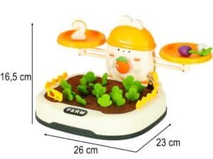 Tabla cu găuri special concepută îi permite copilului să exerseze precizia - introducerea și scoaterea morcovilor dezvoltă dexteritatea manuală, în timp ce jocul „cine recoltează mai repede" introduce un dram de competiție sănătoasă.