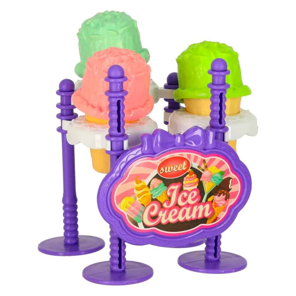 Elemente: înghețată, gogoși, deserturi, lapte, suc, ceașcă, bomboane, lingură pentru înghețată, tavă, platou, suport pentru înghețată, pânză cu cling