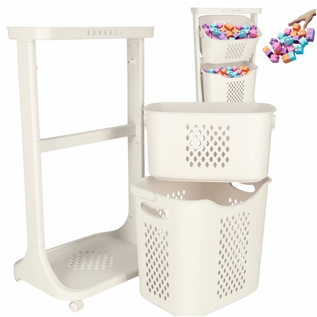 Un organizator cu două niveluri pe roți pentru a vă ajuta să păstrați o varietate de articole organizate. Cel mai mare coș are un mâner pentru a fi transportat cu ușurință. Material: plastic. Dimensiuni: 44 cm x 77,5 cm x 32 cm.
