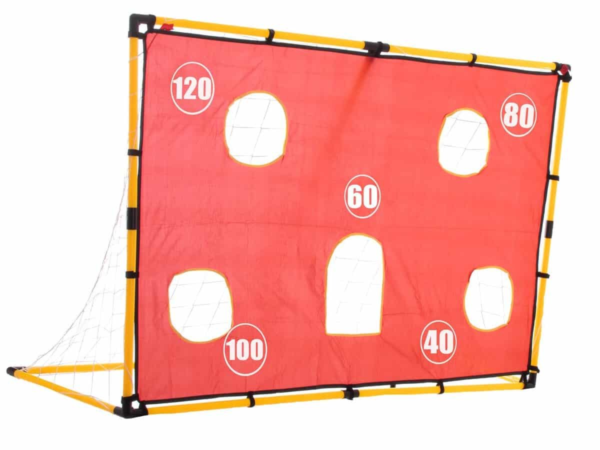 Poarta mare, cu un covor în care au fost făcute găuri, vă va permite să exersați lovituri precise la poartă fără a fi nevoie să implicați portarul.