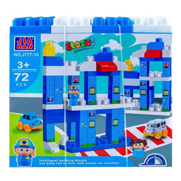 - Blocurile de constructii au diverse forme: cuburi cu dimensiuni jumbo de 3×3 cm si multiplu, ce au inaltimi de 3.7 cm sau 5.7 cm, piese din imbinarea carora se construiesc 3 vehicule (1 masina de politie, 1 ambulanta, 1 masina pentru transport gunoi), 2 figurine (fata si baiat), 1 stegulet. Cuburile au colturile drepte, tesite sau rotunjite.