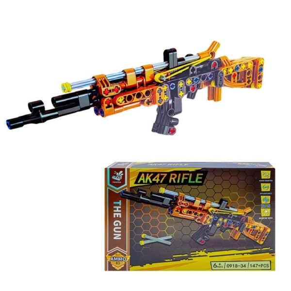 - Piesele continute in pachet au diverse forme, dimensiuni si culori, iar prin imbinarea lor cei mici vor construi o arma cu dimensiuni de 22.4×5.5 cm.