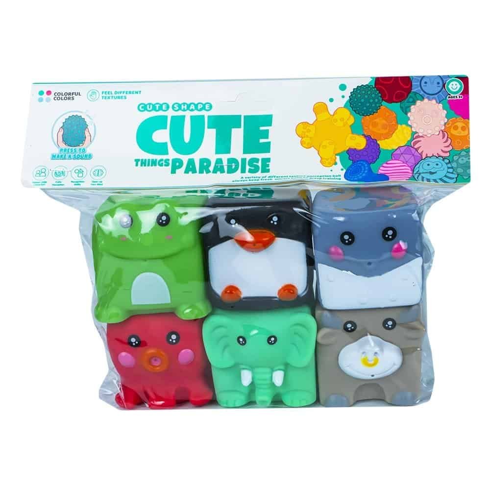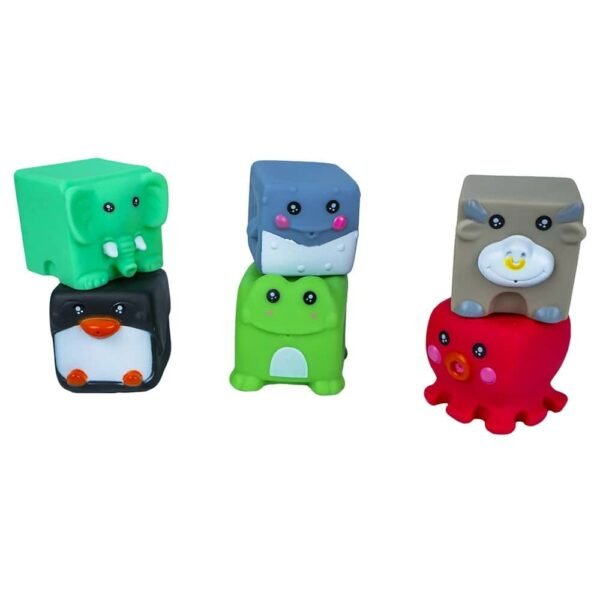 - Setul de 6 cuburi cu animale moi include o broasca verde, o caracatita roz, o vacuta maro, un pinguin negru, un elefant verde si un delfin gri.