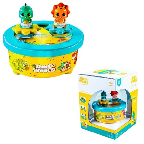 - Jucaria este realizata sub forma de cutie muzicala cu imprimeu cu dinozauri, pe care pot fi plasate cele doua figurine dinozaur.