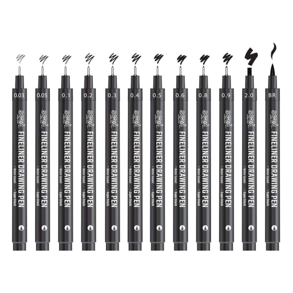 - Setul contine 12 finelinere de culoare neagra cu urmatoarele grosimi ale varfului: 0.03, 0.05, 0.1, 0.2, 0.3, 0.4, 0.5, 0.6, 0.8, 0.9, 2.0 mm si de asemenea, un marker cu varf ascutit, tip pensula.
