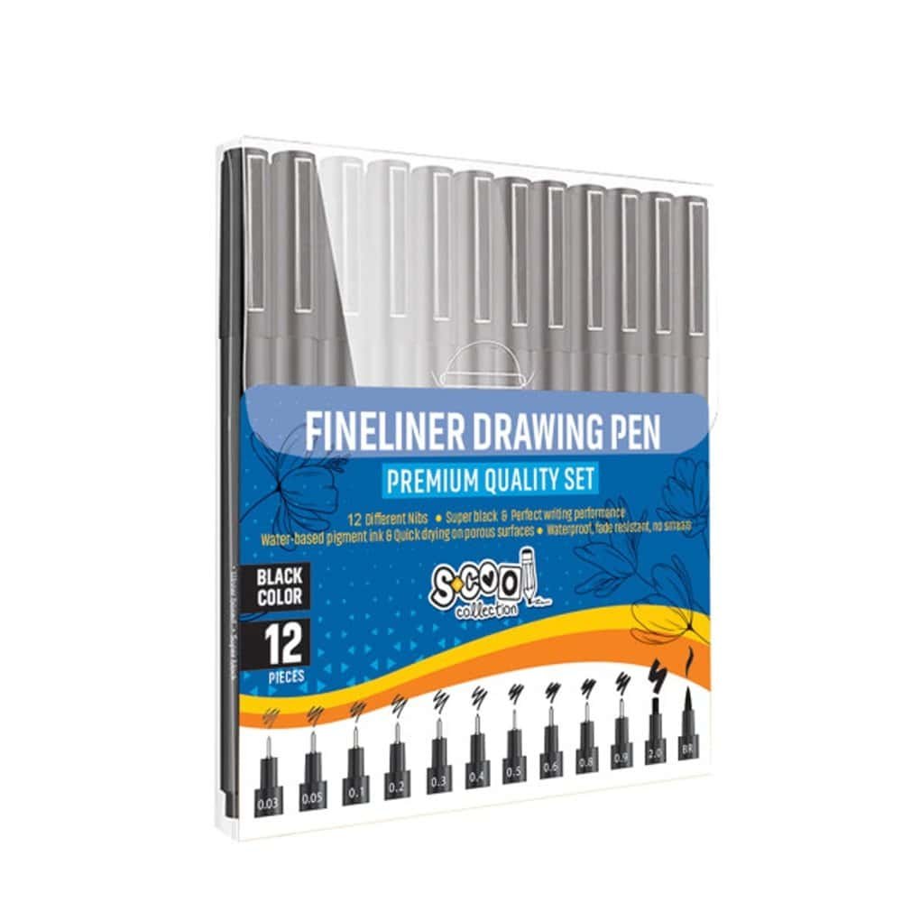 Fineliner, diferite dimensiuni 0.03-2 mm + tip pensula, 12 buc/set - S-COOL