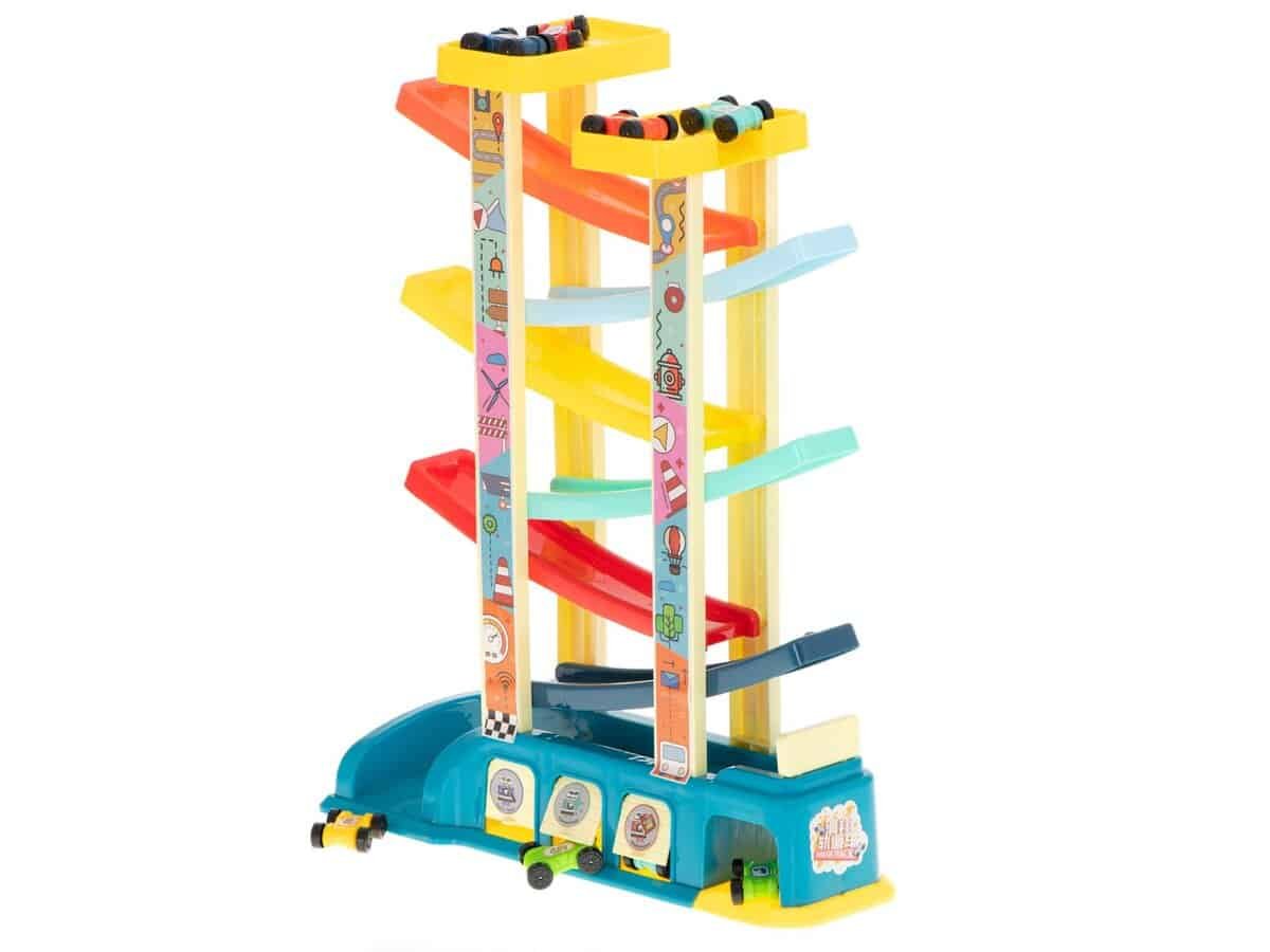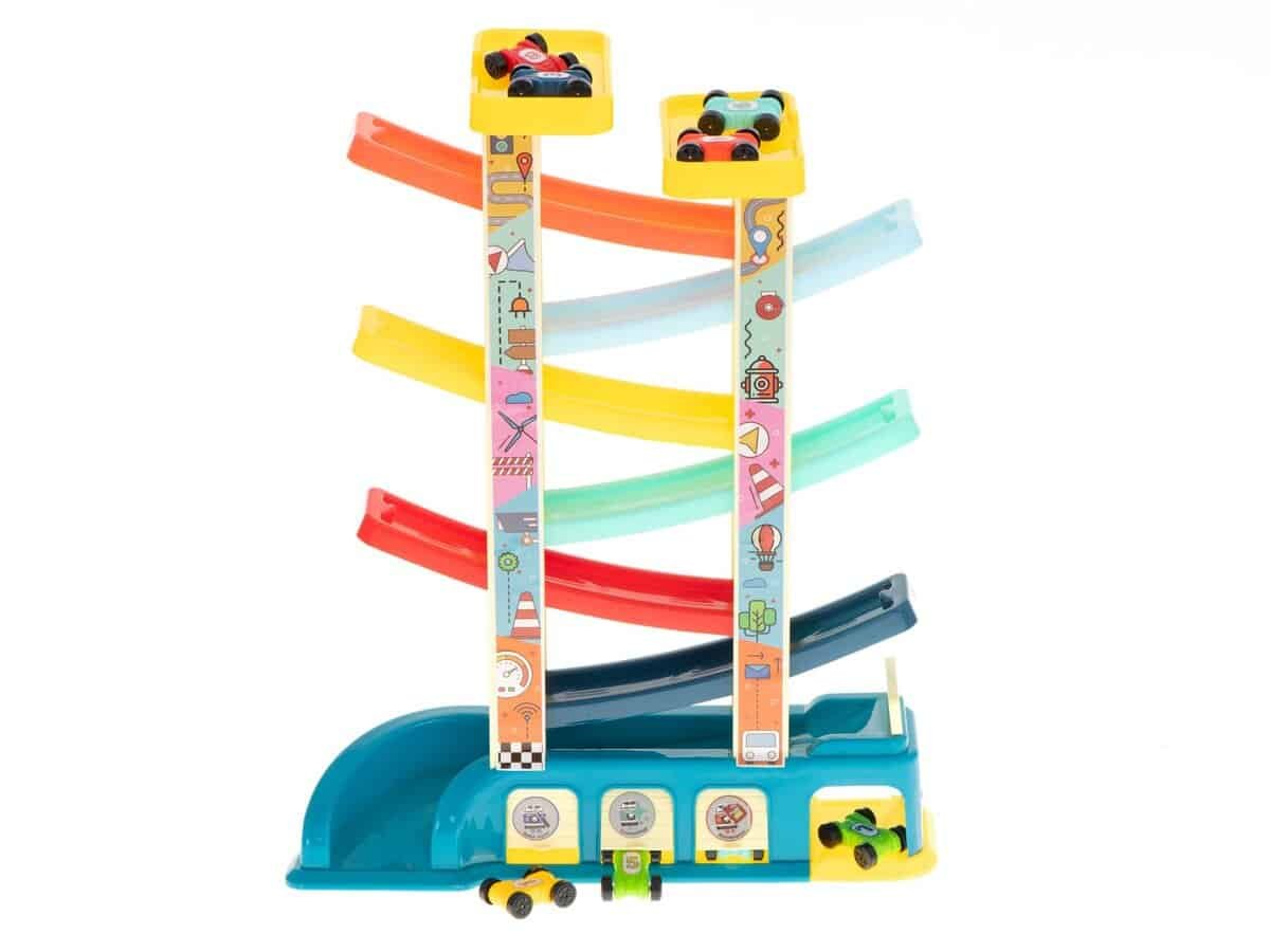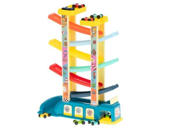Jocul cu toboganul nu este doar foarte distractiv, ci și o formă de învățare. Privind mașinile colorate, copilul învață despre principiile fizicii și își dezvoltă gândirea logică. Manipularea pieselor mici are un efect pozitiv asupra aderenței degetelor copilului.