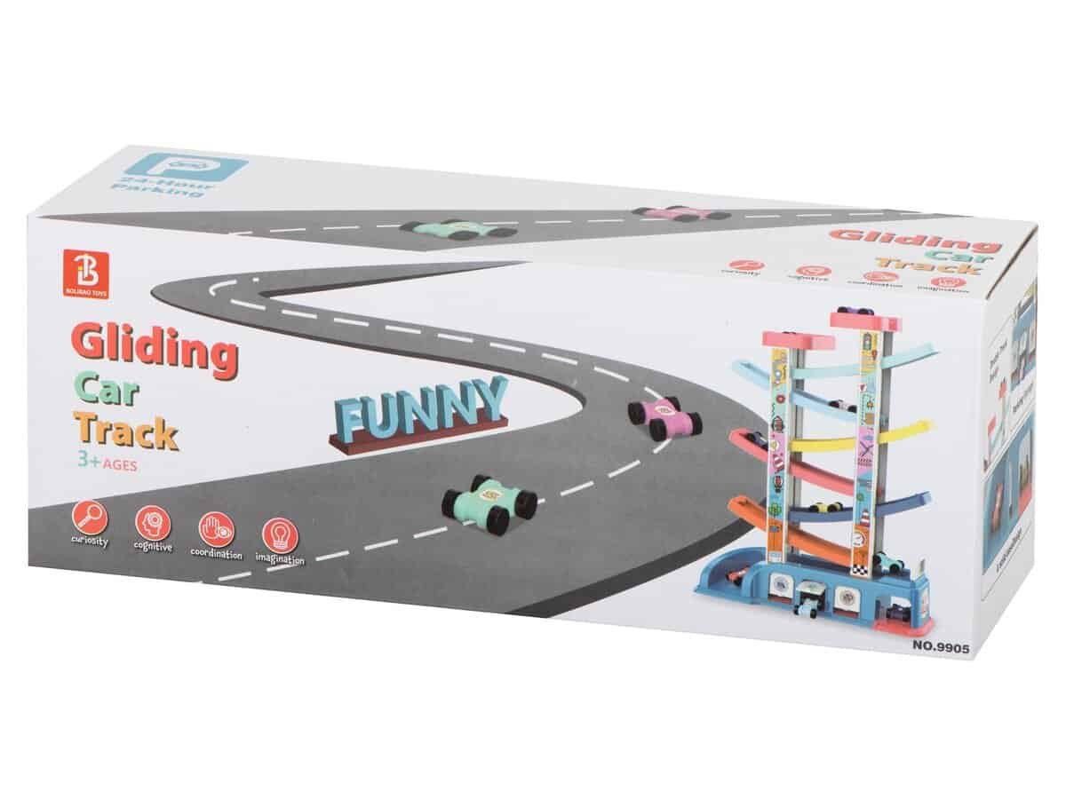 Pistă de mașini cu două etaje cu tobogan + 8 mașini