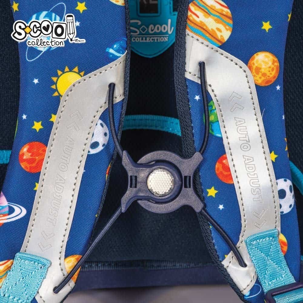 - Bretelele sunt usor ajustabile in functie de inaltimea copilului si greutatea din interiorul ghiozdanului datorita sistemului integrat de reglare a inaltimii, accesibil din interiorul ghiozdanului, prin deschiderea buzunarului. Reglarea este facilitata de gradatiile XS/S/M/L/XL ce pot fi observate prin fereastra exterioara din PVC transparent. Bretelele sunt buretate la nivelul umerilor, au exteriorul din poliester si plasa, prelungire din banda textila, reglabila ca lungime si sunt prevazute cu catarama magnetica, de fixare transversala. Bretelele respirabile si reglabile amelioreaza stresul umarului.