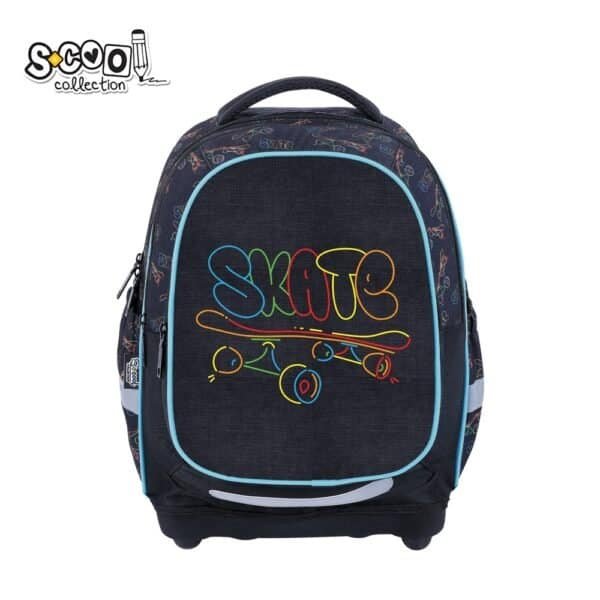 - Ghiozdanul este realizat din poliester 600D cu grafica SKATE.