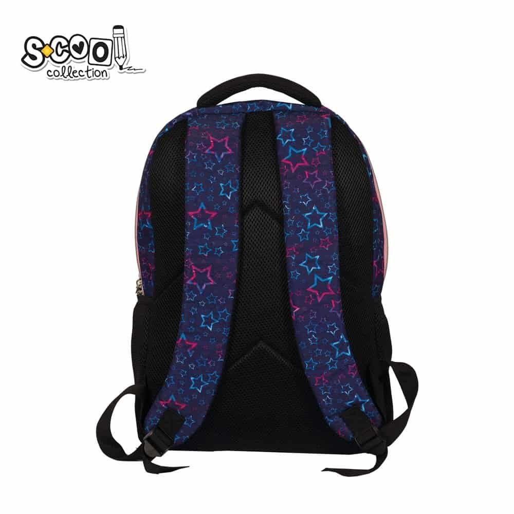 - Ghiozdanul de calitate premium are o compartimentare eficienta. Astfel, compartimentul principal, pe langa un spatiu de depozitare generos, este prevazut cu buzunar buretat pentru laptop. Buzunarul are in partea superioara elastic. Compartimentul secundar este practic pentru asezarea documentelor, caietelor, cartilor si este prevazut cu organizator cu trei buzunare potrivite pentru accesorii sau instrumente de scris. In partea frontala rucsacul are 2 buzunare, unul decorat cu imprimeu metalizat multicolor, iar celalalt cu exteriorul realizat din saten multicolor cu stelute matlasate. Compartimentele si buzunarele au inchideri cu fermoare prevazute cu extractoare usor de manevrat, compartimentele avand fermoar cu dubla tragere.