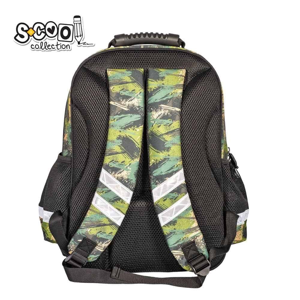 - Ghiozdanul are compartiment principal, compartiment secundar, buzunar frontal si 2 buzunare laterale, 2 bretele buretate, reglabile, spate anatomic, ramforsat, benzi reflectorizante 360 grade, maner cu manson din plastic.