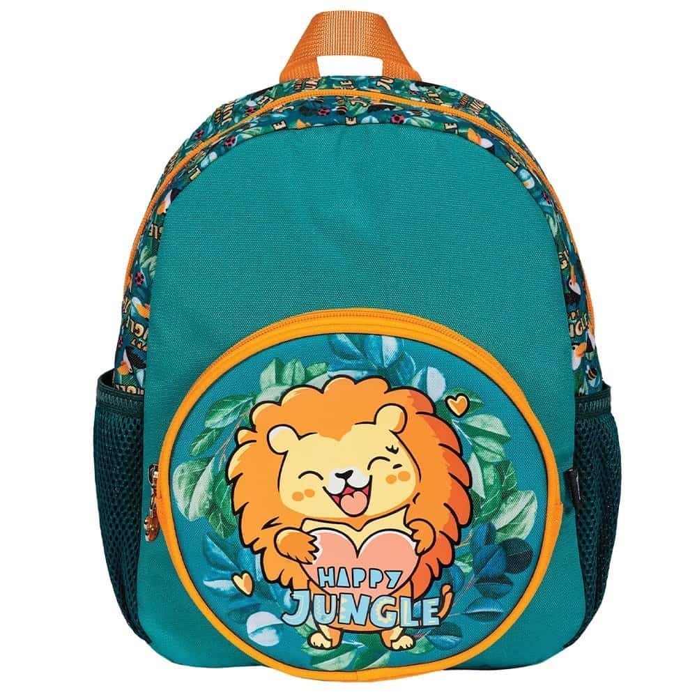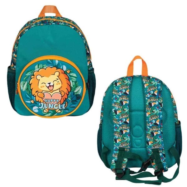 - Rucsacelul pentru copii cu varsta prescolara, are un compartiment cu buzunar 1/2, buzunar frontal cu imprimeu PVC „Happy Jungle", doua buzunare laterale, inchideri cu fermoar, bretelele reglabile , spate buretat, maner, pandandive metalizate ursulet.