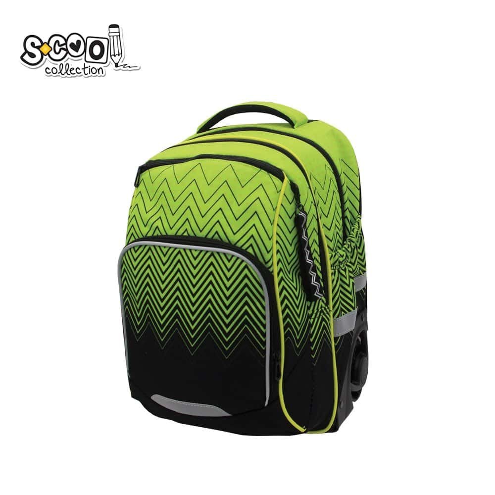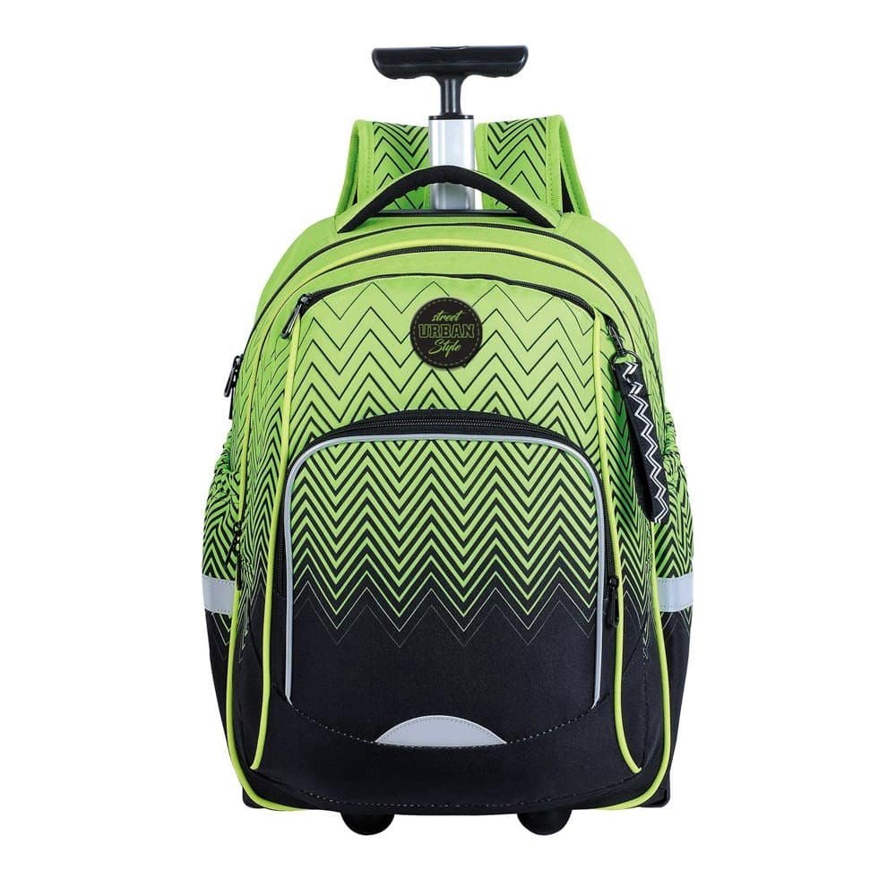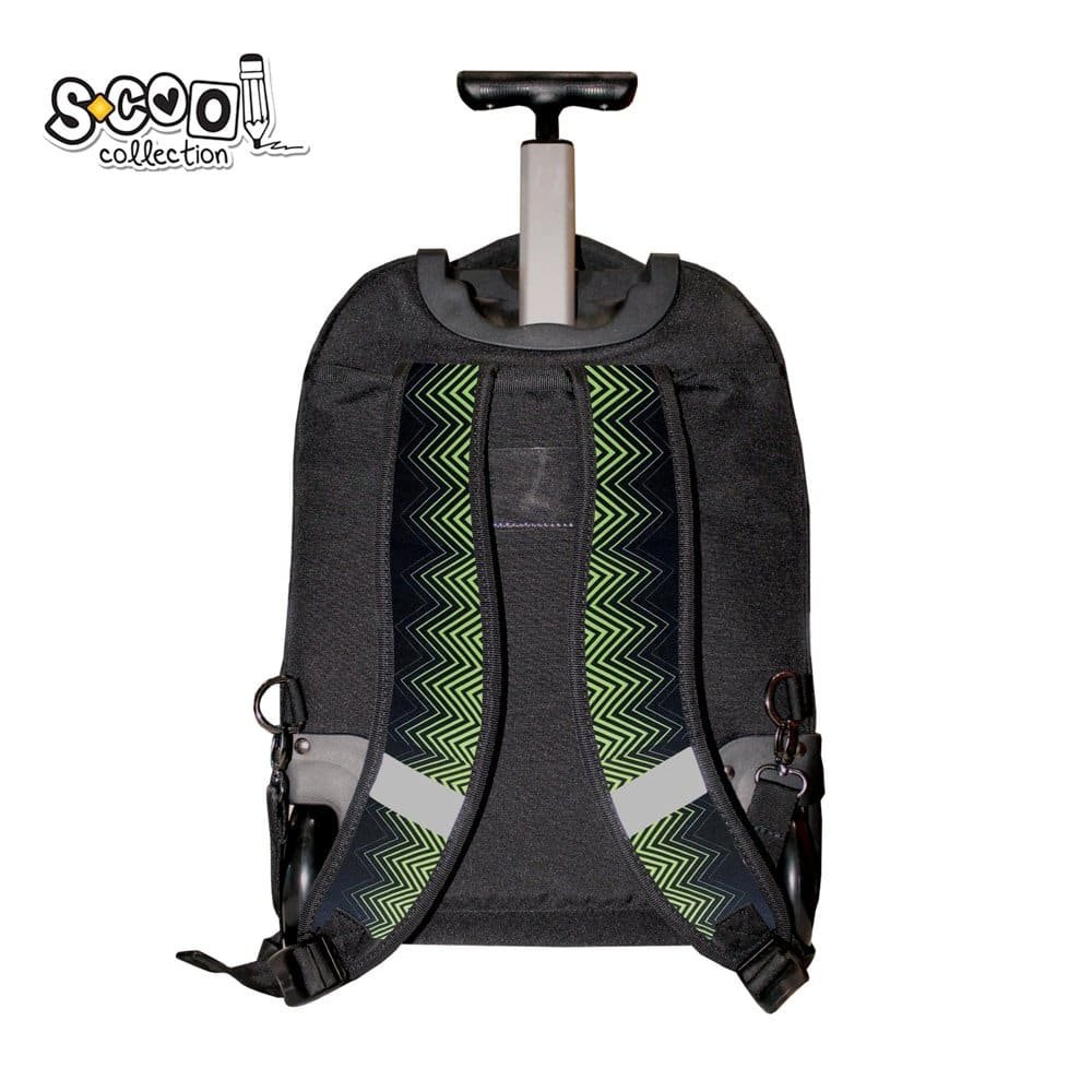 - Ghiozdanul trolley are un compartiment principal cu buzunar, un compartiment pentru laptop cu organizator si portchei, doua buzunare frontale si doua buzunare laterale, sistem integrat de tragere, doua roti, inchidere cu fermoare, maner extensibil, bretele ajustabile, buretate, spate buretat, benzi reflectorizante baza intarita, cu doua picioruse.