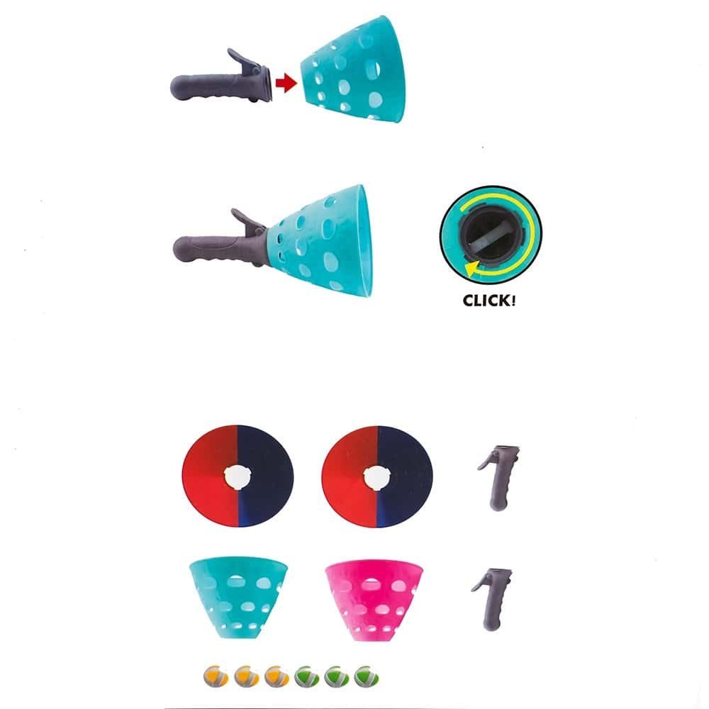 - Manerele ergonomice sunt prevazute cu cate o clema care prin apasare arcuieste banda interioara, din plastic, aceasta arcuire brusca propulsand rapid mingea in directia in care este indreptata cupa/ discul. Prindeti mingile aruncate de partenerul de joc si aruncati-le inapoi rapid, pentru cat mai multa distractie!