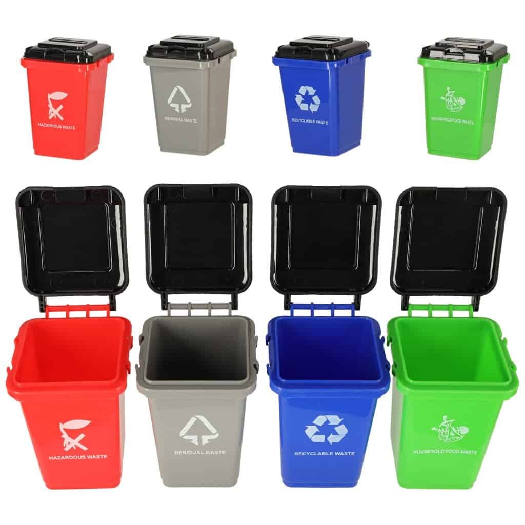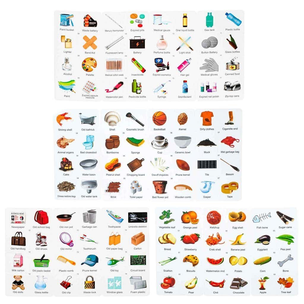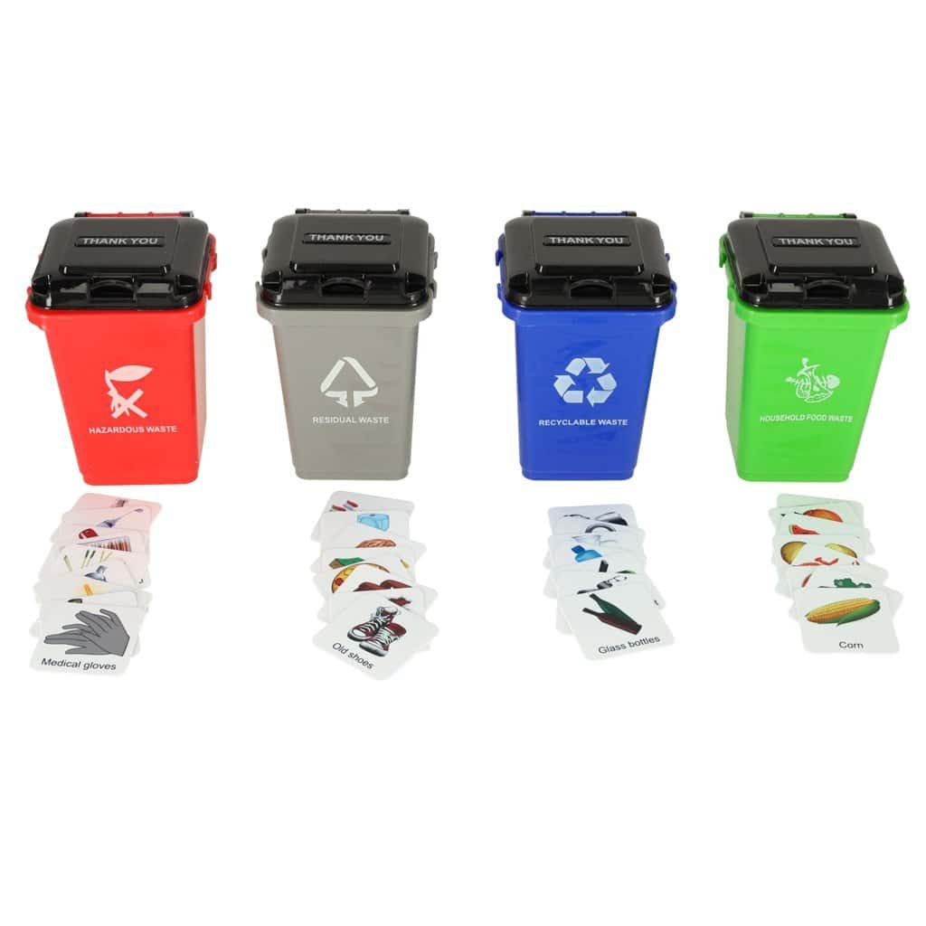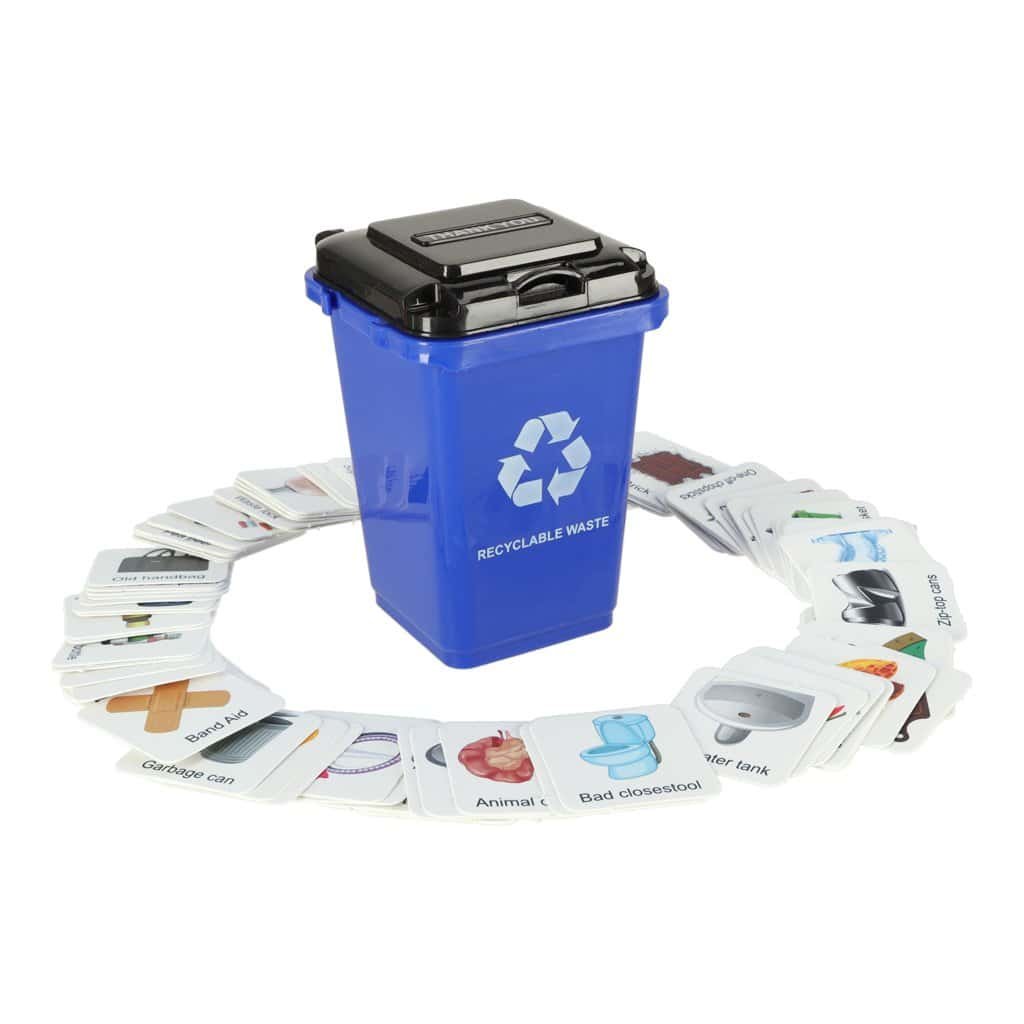 Un joc educativ care separă gunoiul dezvoltă conștiința de mediu și, în plus, învață limba engleză, cărțile incluse în set sunt semnate în engleză, setul include și 4 pubele. Dimensiunile coșului 12×5,5×5,5×5,5 cm, cărți 4,5×4,5 cm.
