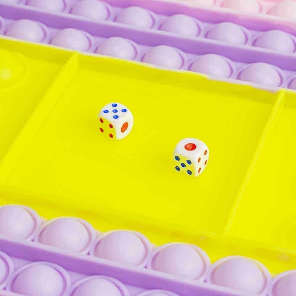 - jucarie senzoriala in forma de tableta multicolora, cu 2 zaruri si loc pentru aruncat zarurile (120 bule mici multicolore + 6 bule mari)