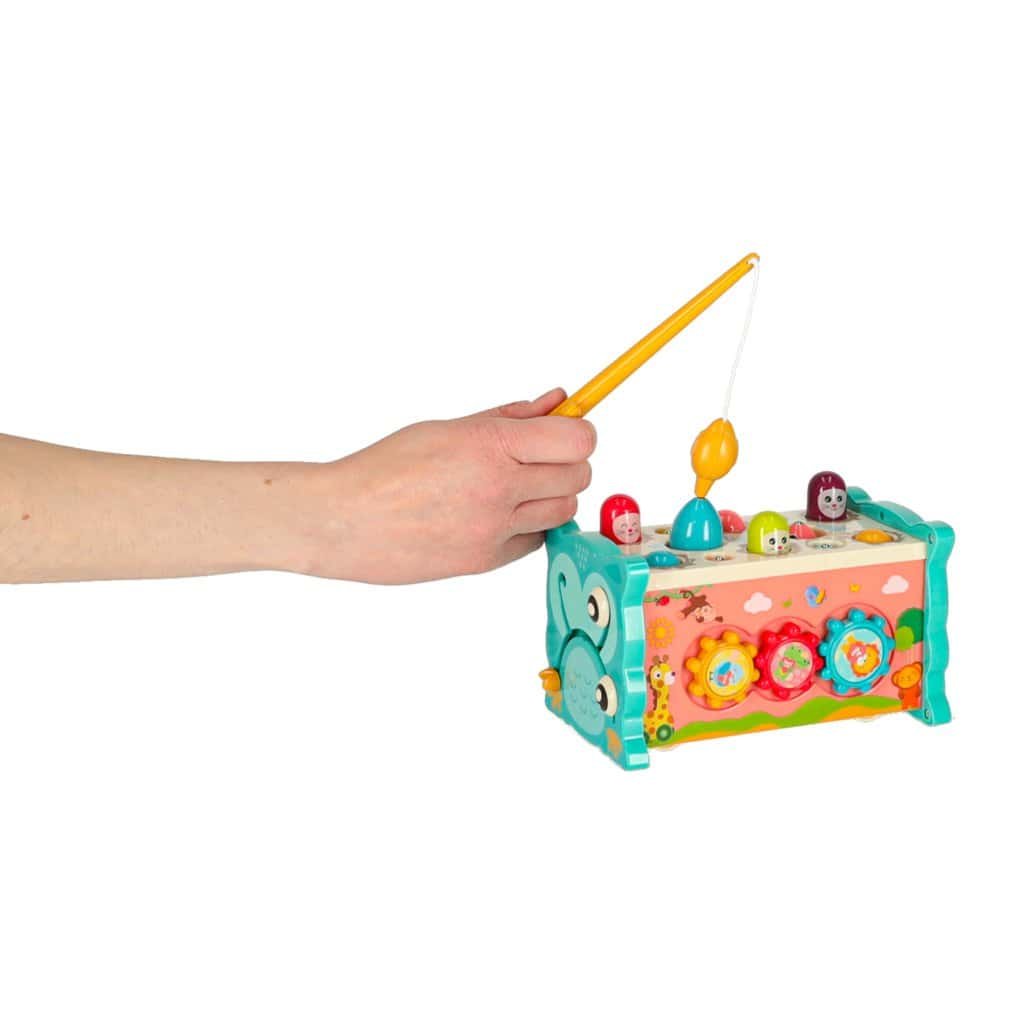 În plus, jucăria vă permite să prindeți pești colorați și viermi cu undița inclusă, ceea ce dezvoltă precizia și răbdarea. Copilul poate, de asemenea, să învețe elementele de bază ale funcționării unui ceas, să întoarcă rotițele colorate și să miște mașinuțele prin labirint. Cu o varietate de activități, setuloferă ore întregi de distracție, stimulând în același timp simțurile copilului prin culori intense și o varietate de forme.