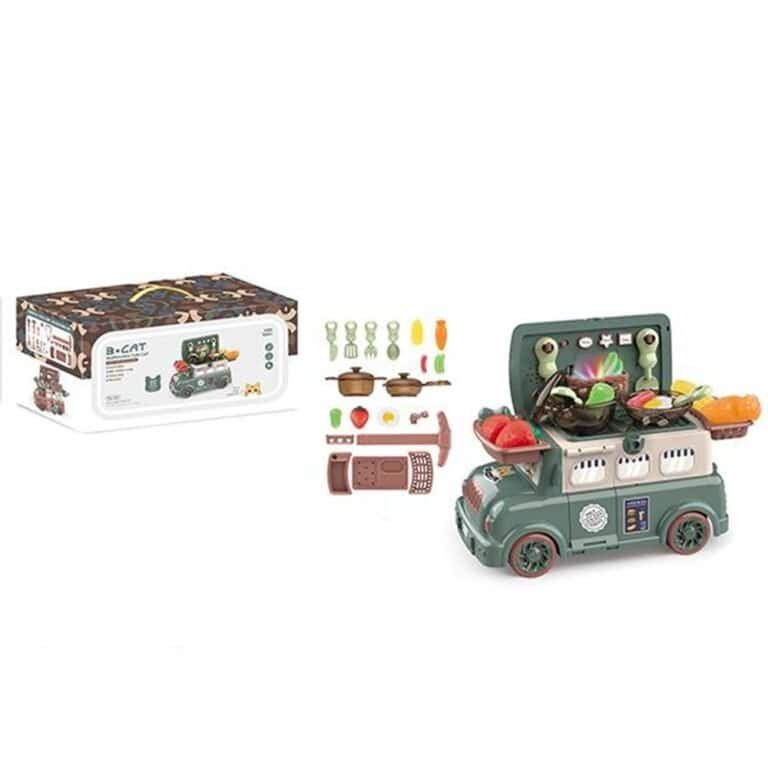 - Setul contine: masinuta care devine masuta de lucru pentru micii bucatari, 4 ustensile bucatarie, 1 cratita, 1 oala, 1 capac, porumb, morcov, carnat, 2 pastai de fasole, ochi de ou, capsune, salata.