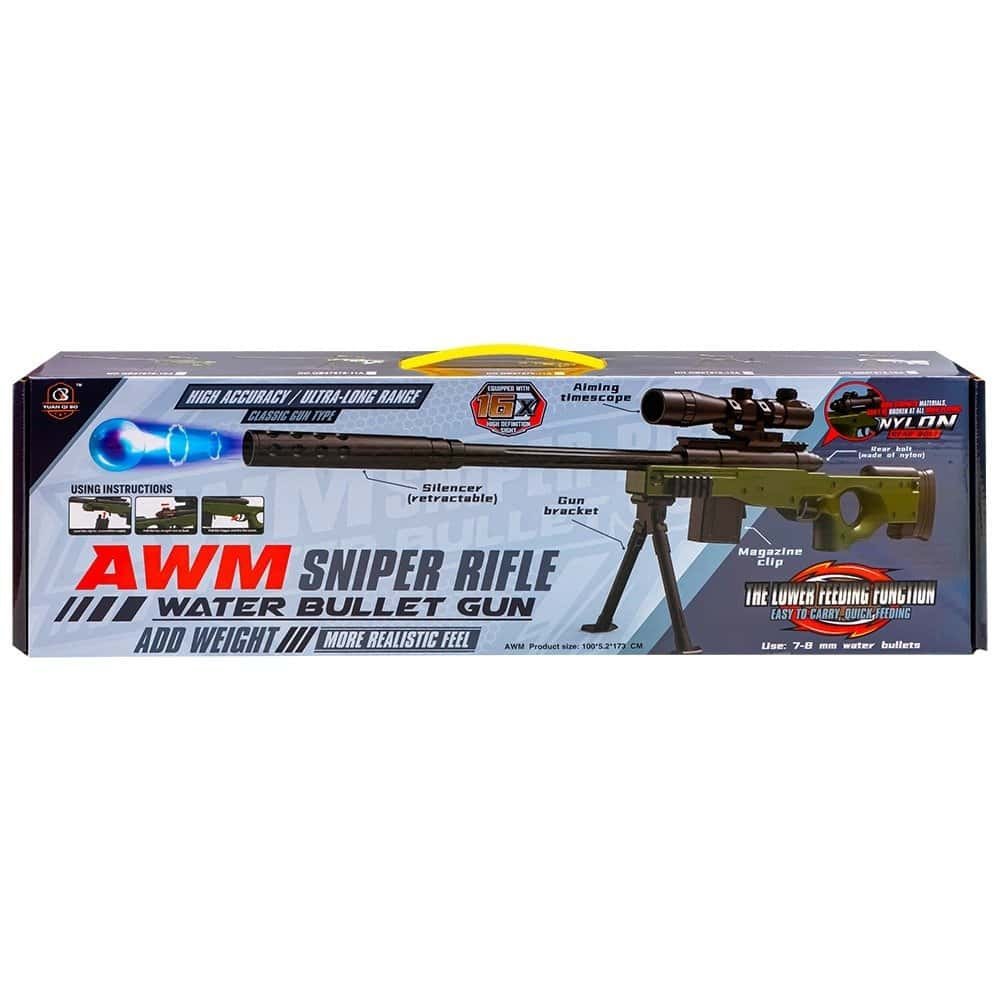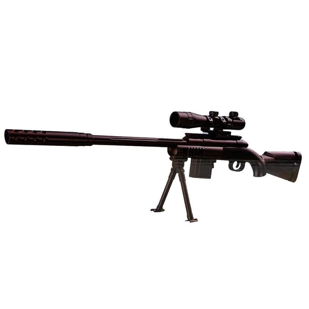 - Mitraliera este realizata din plastic negru, cu un design realist. Inainte de utilizare, la arma se ataseaza teava si se instaleaza accesoriile: amortizorul, luneta suportul si incarcatorul cu bile. Dupa pregatirea armei tot ce trebuie sa faceti este sa tintiti, vizorul facilitand tintirea, sa armati si sa apasati tragaciul. Pusca are antrenare cu arc, asa incat trebuie armata dupa fiecare tragere. Distanta de tragere este de aproximativ 15 metri. Luneta cu marire x16 ofera o vedere de inalta definitie. Pentru glisarea pe sina a lunetei apasati butonul de pe aceasta, iar pentru detasarea incarcatorului in vederea reumplerii cu bile apasati clapeta din spatele acestuia.