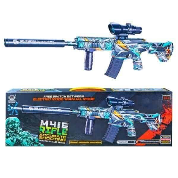 - Mitraliera are design ce copiaza forma celebrului automat M14A6. Arma are un imprimeu grafitti. Inainte de utilizare trebuie instalata bateria in spatiul destinat, de pe maner. Utilizarea mitralierei este usoara. Astfel, instalati unul din cele doua capete pe teava armei, apoi luneta si manerul prin glisare. introduceti incarcatorul cu bile hidratate, conectati bateria, pozitionati comutatorul pe modul de folosire automata (rasucit spre fata) sau manuala (rasucit spre spate / in acest mod trebuie armata pusca prin tragerea manetei spre partea din spate), apasati pe tragaci pentru a lansa bilele / bila. Distanta de tragere este de aproximativ 15 metri (daca acumulatorul nu este incarcat suficient distanta de tragere va scadea).
