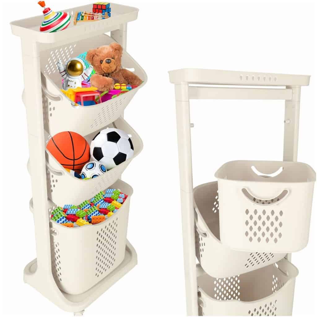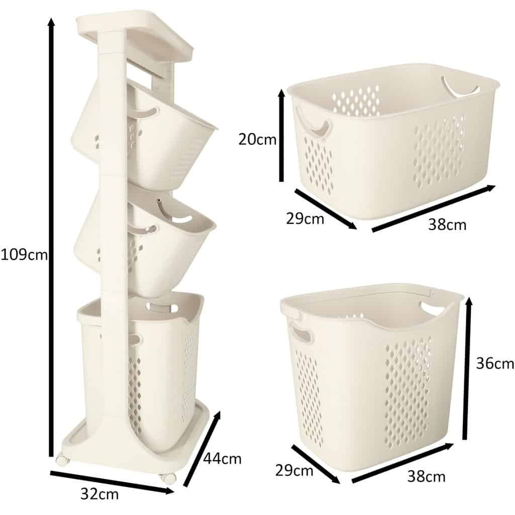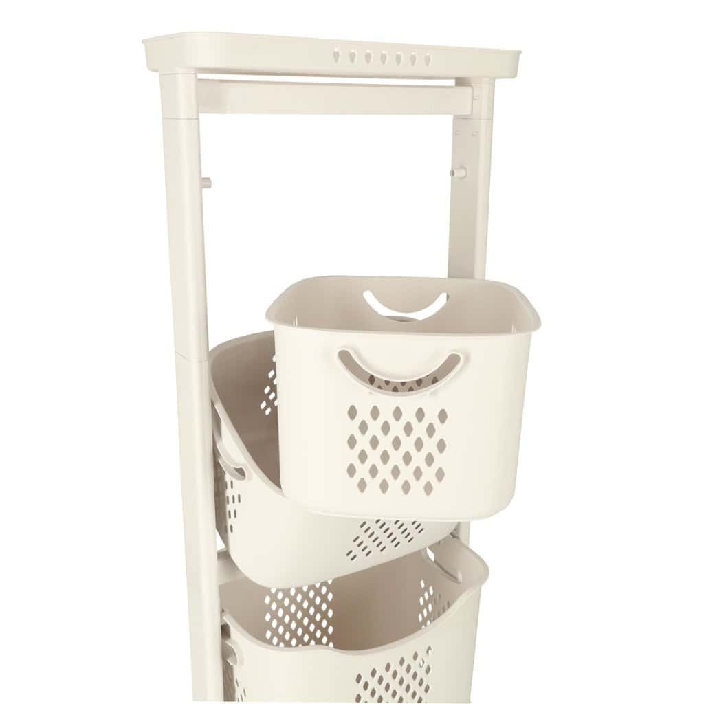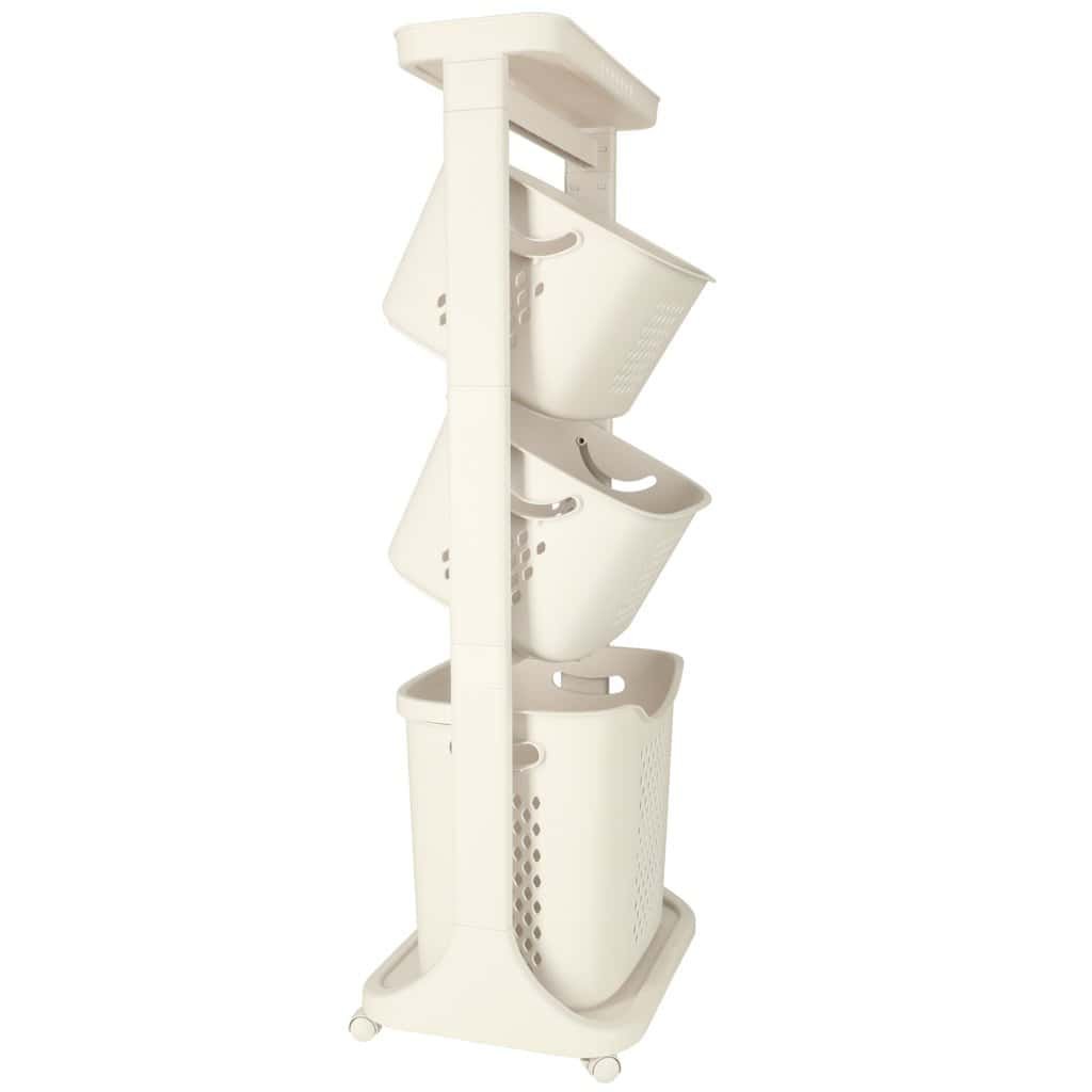 Organizator pe trei niveluri pe roți pentru organizarea ușoară a unei varietăți de articole. Cel mai mare coș are un mâner pentru a fi transportat cu ușurință. Material: plastic. Dimensiuni: 44 cm x 109 cm x 32 cm.