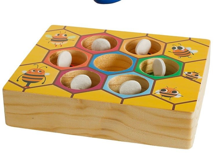 Un joc educațional din lemn, decorat cu o imagine. Jocul constă în introducerea a 7 albine de culoarea potrivită în găuri cu ajutorul unei pensete. Jocul va stimula gândirea logică, va învăța răbdarea și va ajuta la învățarea numelor de culori. Dimensiuni: 16,5×13,5×3,5 cm.