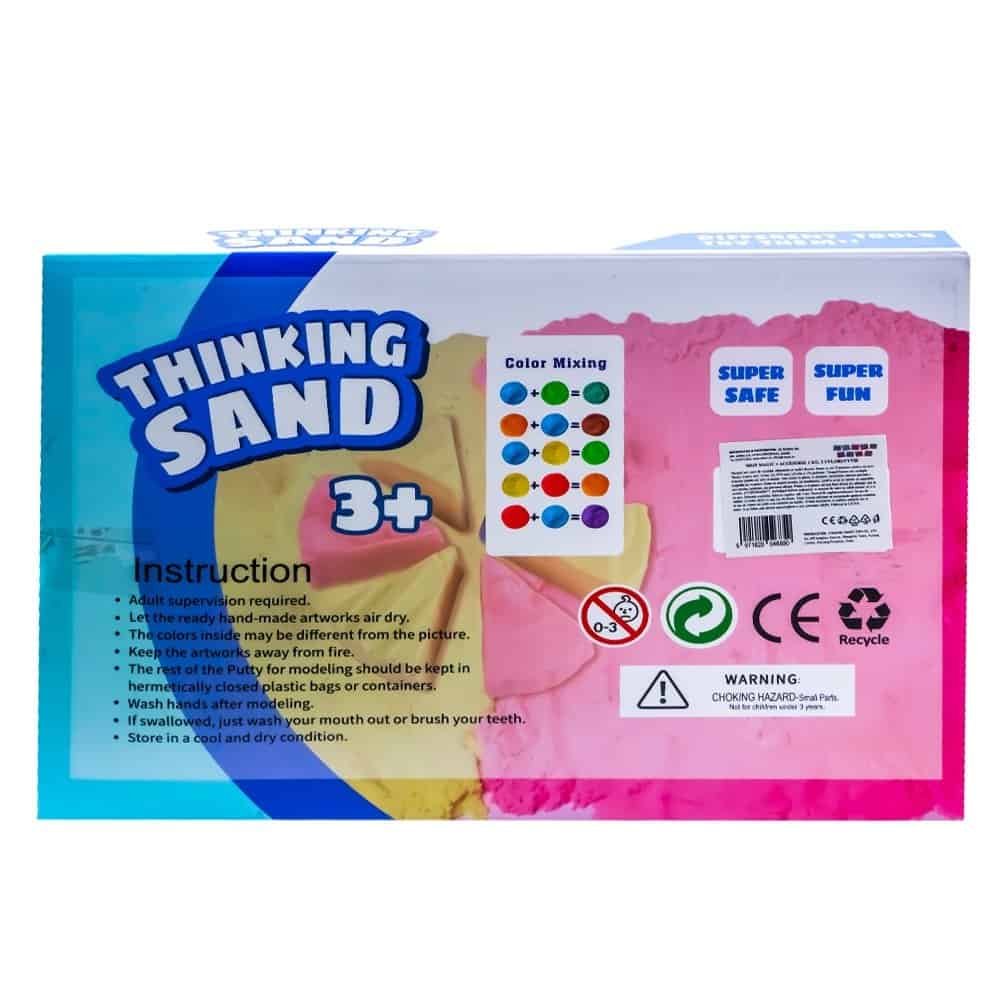 - Nisipul este compus din nisip si aditivi non toxici, fiind un produs special, kinetic, la care firimiturile de nisip se lipesc una de alta. Se poate modela exact ca nisipul umed de pe plaja. La prima folosire este indicat sa il framantati bine pentru a ajunge la caracteristicile specificate. Cele doua pungi contin nisip in culori diferite, culorile variind per set. Nisipul nu se uda sau nu se manipuleaza cu mainile ude deoareace isi pierde proprietatile. In situatia in care este udat se lasa la uscat si isi va reveni.