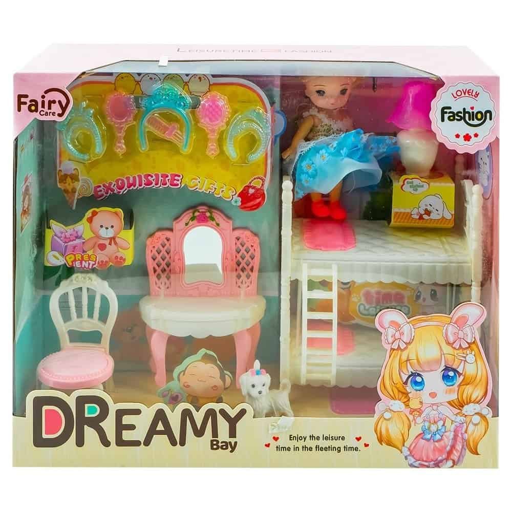 - Papusa este insotita de accesorii care aduc un plus de frumusete si varietate jocului: 1 figurina catel, 1 pat etajat, 1 masuta de toaleta, 1 scaun, 1 veioza, 1 cordelute, 2 coliere, 1 oglinda, 1 pieptan, 1 perie de par. Accesoriile din plastic vor insoti papusa in diversele scenarii de joc.