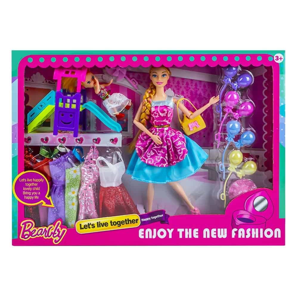 - Setul contine : 1 papusa cu poseta, 1 papusica, 1 tobogan, 1 moara de vant, 4 baloane, 1 palarie, 6 x rochite ce vor completa garderoba papusii.