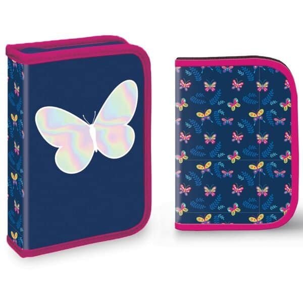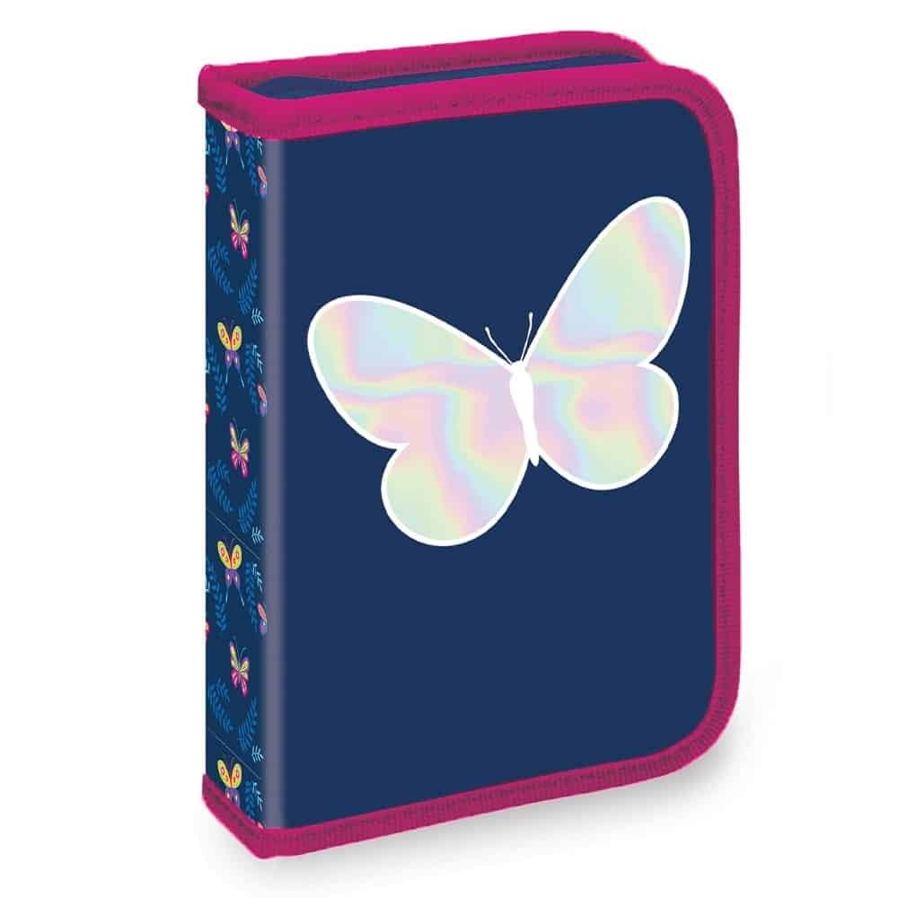- Penarul este realizat din poliester decorat cu sclipici, cu grafica BUTTERFLY si are carcasa cartonata si buretata, 2 extensii cartonate, inchidere cu fermoar, 30 benzi elastice pentru fixarea echipamentului si 2 buzunare.