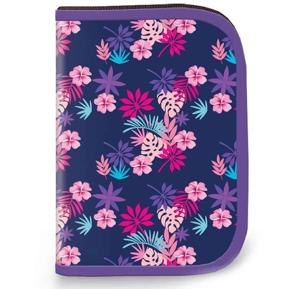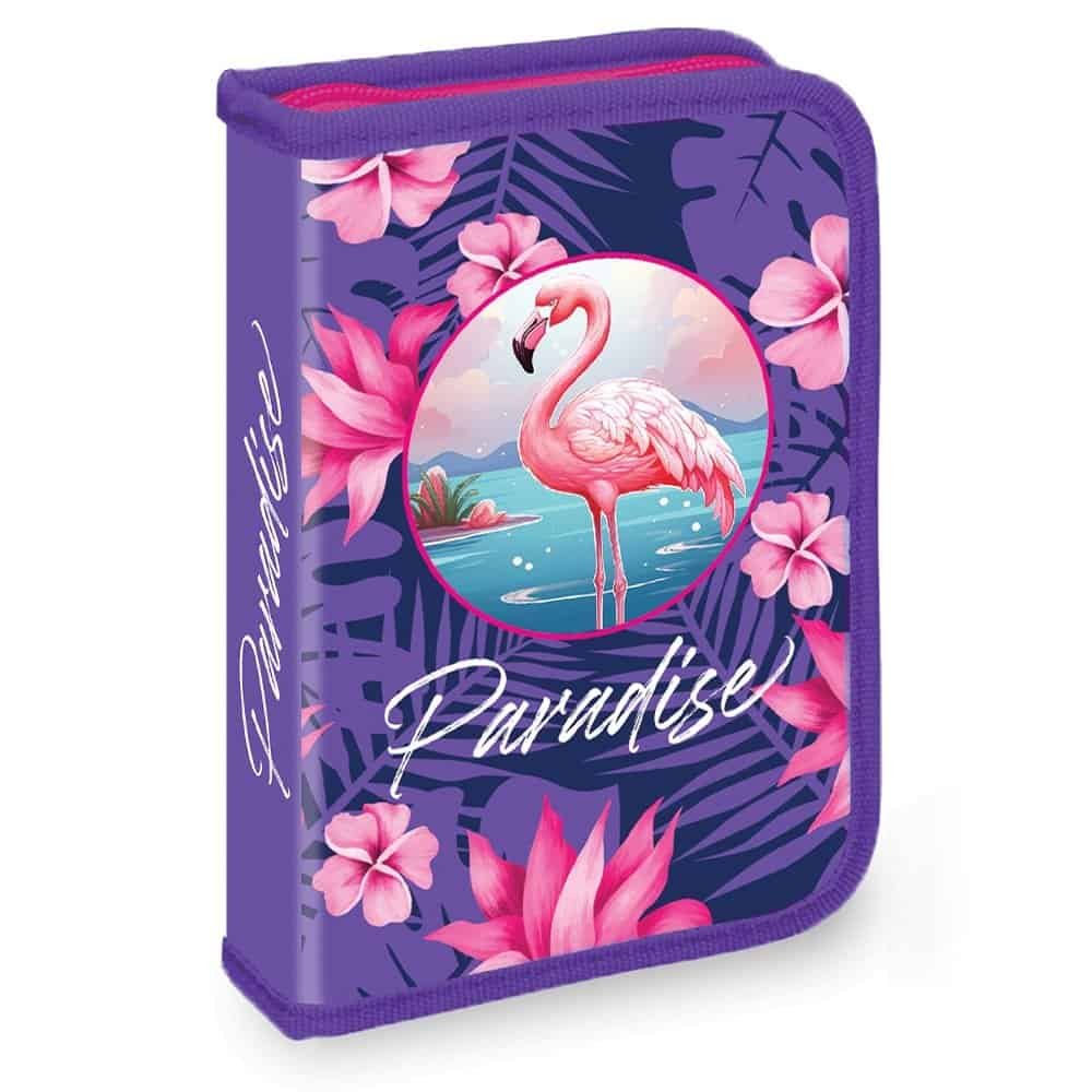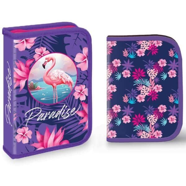 - Penarul este realizat din poliester decorat cu sclipici, cu grafica PARADISE si are carcasa cartonata si buretata, 2 extensii cartonate, inchidere cu fermoar, 30 benzi elastice pentru fixarea echipamentului si 2 buzunare.