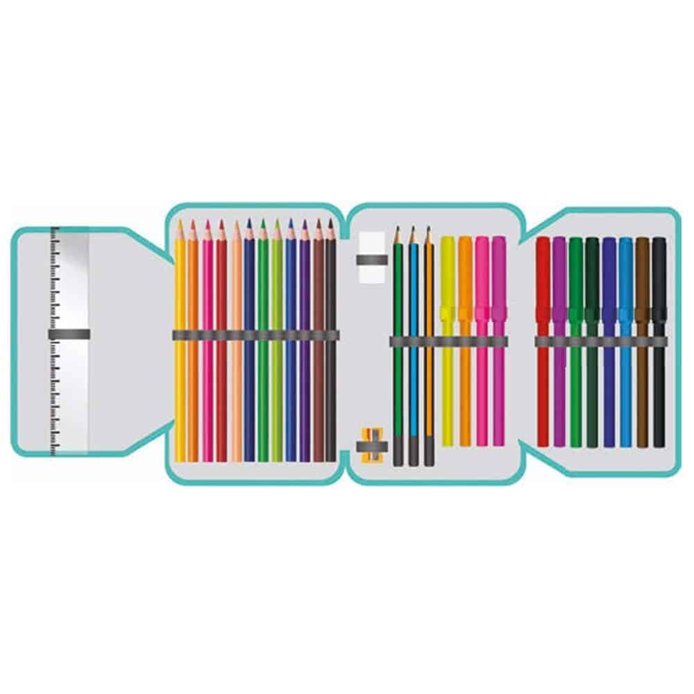 - Acesta are 2 extensii si este echipat cu 32 piese: 12 creioane colorate, 3 creioane grafit, 12 carioci, 1 ascutitoare, 1 radiera, 1 rigla, 1 orar si 1 tabel cu tabla inmultirii.