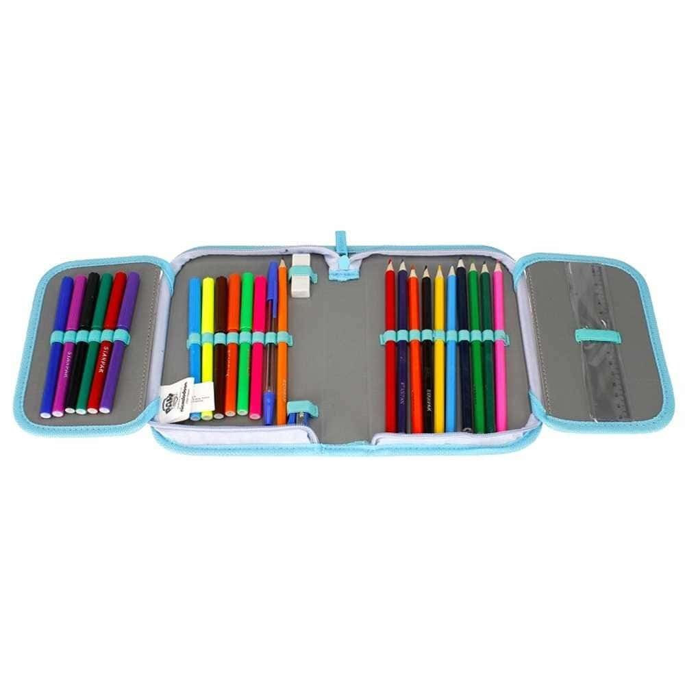 Toc pentru instrumente de scris, complet echipat, cu 2 aripi si suporturi flexibile pentru rechizite scolare, se inchide cu fermoar puternic.