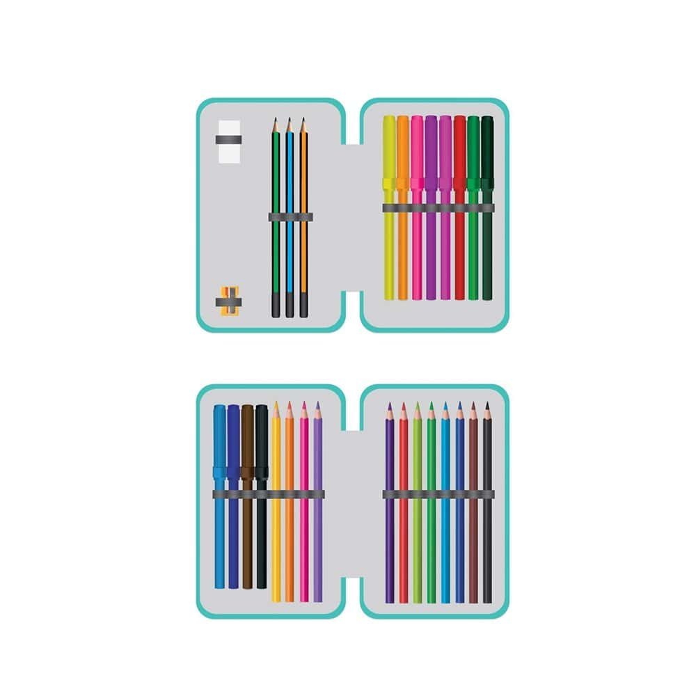 - Acesta este echipat cu 29 piese: ascutitoare, radiera, 3 creioane grafit, 12 carioci, 12 creioane colorate.