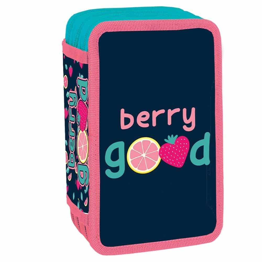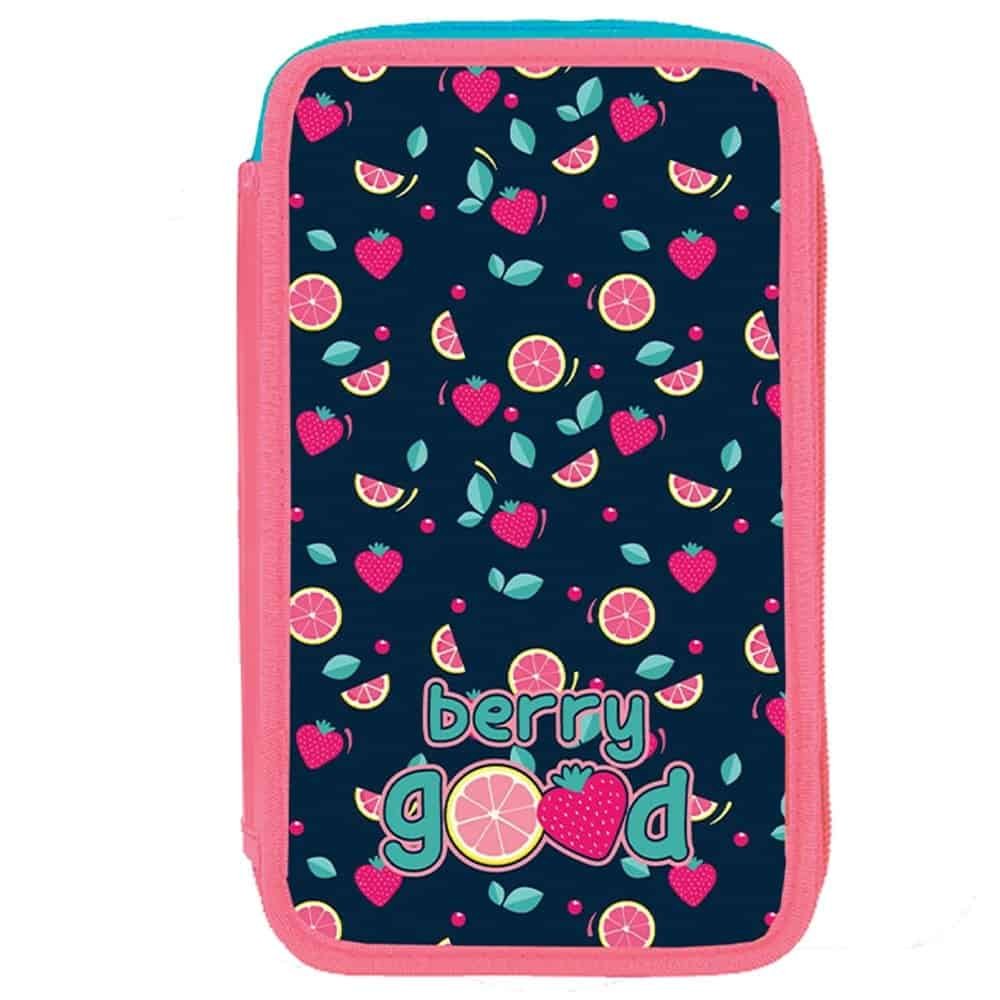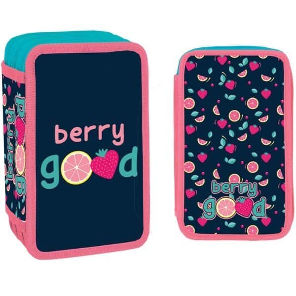 - Penarul este fabricat din poliester decorat cu sclipici, cu grafica BERRY GOOD si are 3 compartimente cu inchidere cu fermoare, carcasa buretata si cartonata, benzi elastice pentru fixare articole.