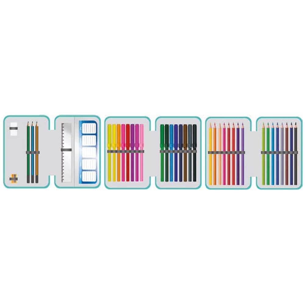 - Acesta este echipat cu 39 piese: 16 creioane colorate, 3 creioane grafit, 16 carioci, 1 ascutitoare, 1 radiera, 1 rigla si 1 orar.