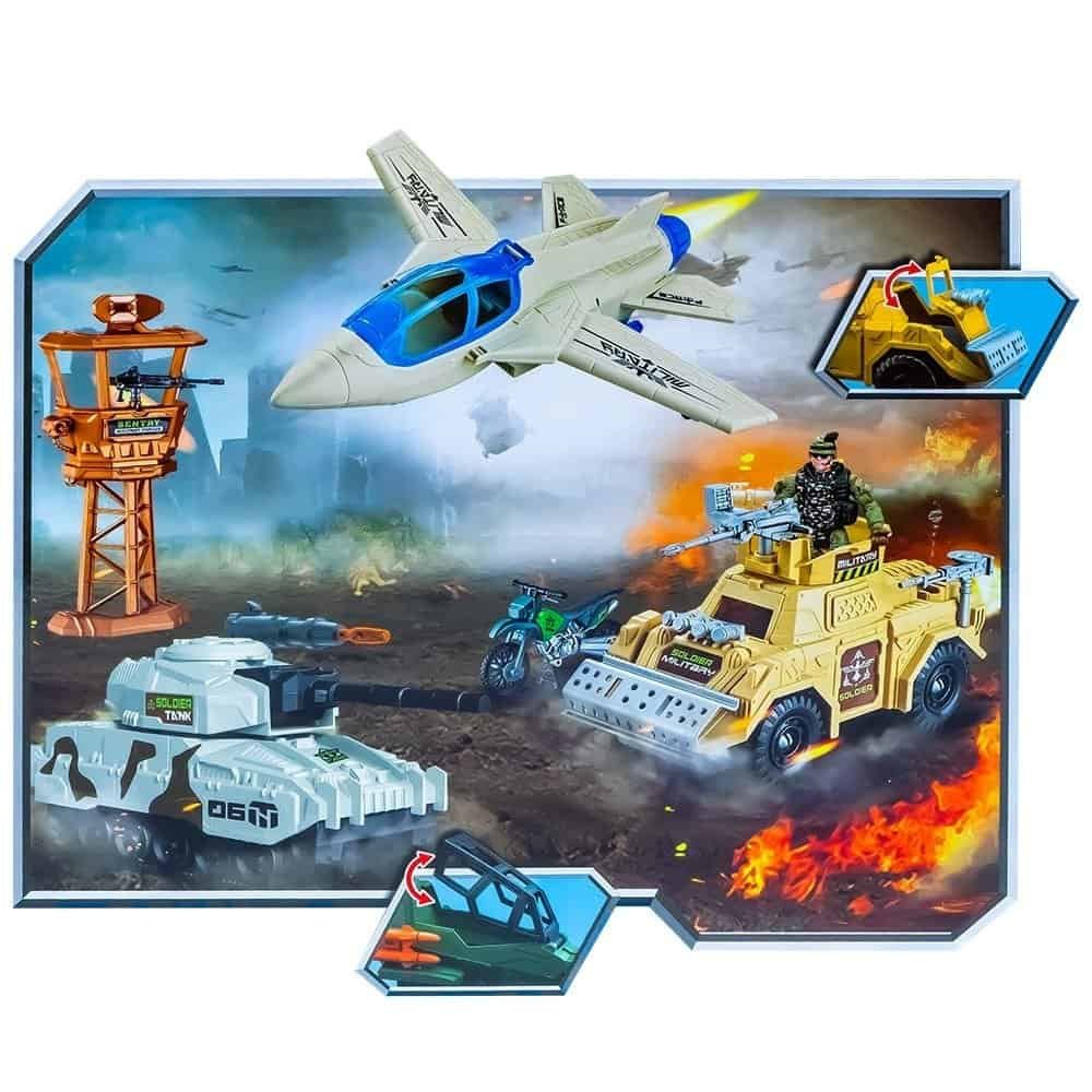- De la tanc la drona, motocicleta, figurina soldat, turn de veghe si 2 proiectile, acest set de joaca are incluse o varietate de piese care datorita designului realist asigura o experienta de joc autentica si captivanta.